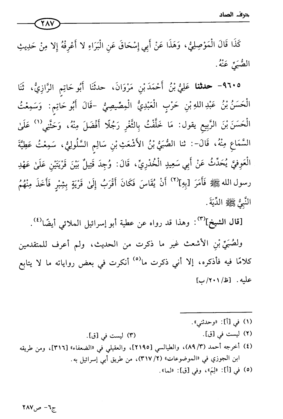 9605 - حَدثنا علي بن أحمد بن مروان، حَدثنا أَبو حاتم الرازي، حَدثنا الحسن بن عَبد الله بن حرب العبدي المصيصي،- قال أَبو حاتم: وسمعت الحسن بن الربيع يقول: ما خلفت بالثغر رجلاً أفضل منه، وحدثني علي السماع منه -، قال: حَدثنا الصبي بن الأشعث بن سالم السلولي، سمعت عطية العوفي يحدث، عن أبي سعيد الخدري قال: وُجِد قتيل بين قريتين علي عهد رسول الله صَلي الله عَليه وسلم، فأمر به أن يقاس، فكان أقرب إلي قرية بشبر، فأخذ منهم النبي صَلي الله عَليه وسلم الدية.