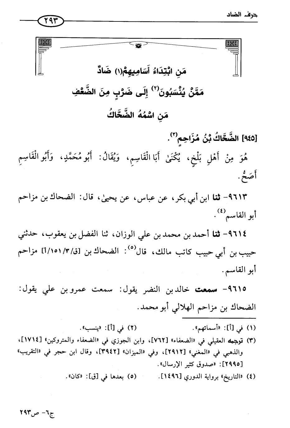 9615 - سمعت خالد بن النضر يقول: سَمعتُ عَمرو بن علي يقول: الضحاك بن مزاحم الهلالي أَبو مُحمد.