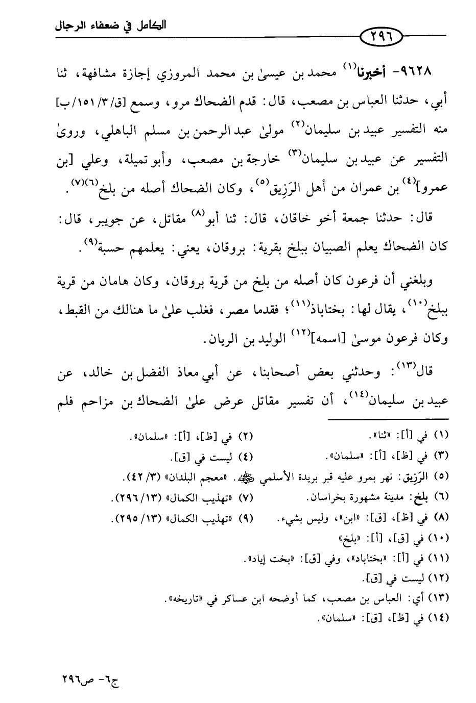 9628 - أخبرنا مُحمد بن عيسي بن مُحمد المروزي إجازة مشافهة، حَدثنا أبي، حَدثنا العباس بن مصعب قال: قدم الضحاك مرو، وسمع منه التفسير عُبيد بن سُلَيمان، مولي عَبد الرحمن بن مسلم الباهلي، وروي التفسير عن عُبيد بن سُلَيمان: خارجة بن مصعب، وأَبو تميلة، وعلي بن عَمرو بن عمران من أهل الرزيق، وكان الضحاك أصله من بلخ.