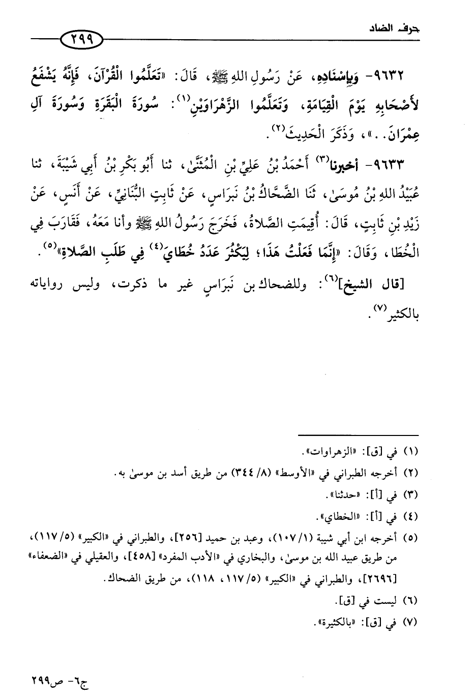 9632 - وبإسناده؛ عن رسول الله صَلي الله عَليه وسَلم قال: تعلموا القرآن فإنه يشفع لأصحابه يوم القيامة، وتعلموا الزهراوين: سورة البقرة وسورة آل عمران، وذكر الحديث.