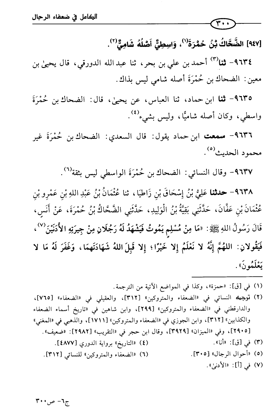(1) «الضَّحَّاك بن حُمرَة»، بضم المهملة، وبالراء، انظر: «المؤتَلِف والمختَلِف» للدارقطني 2/ 595، و «الإِكمال» لابن ماكولا 2/ 501، و «توضيح المُشْتَبِه» 3/ 308، و «تبصير المُنتَبه» 1/ 457، و «تقريب التهذيب» (2966).