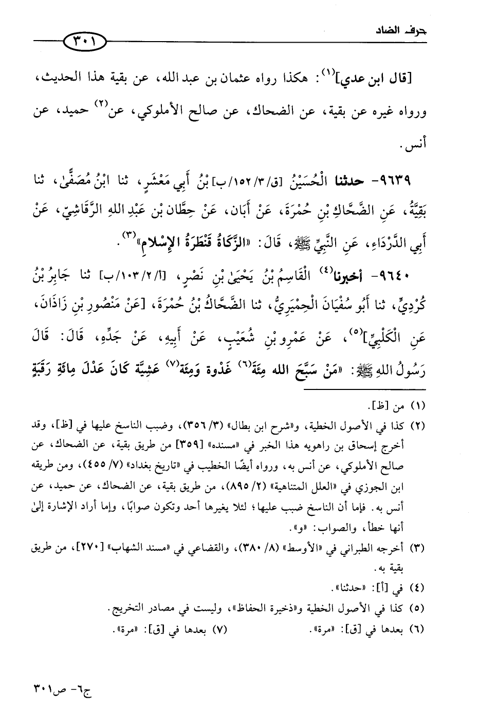 9640 - أخبرنا القاسم بن يَحيي بن نصر، حَدثنا جابر بن كردي، حَدثنا أَبو سفيان الحميري، حَدثنا الضحاك بن حمرة، عن منصور بن زاذان، عن الكلبي، عن عَمرو بن شُعَيب، عن أبيه، عن جَدِّهِ، قال رسول الله صَلي الله عَليه وسَلم: من سبح الله مِئَة غدوة ومئة عشية كان عدل مِئَة رقبة يعتقها، الحديث.