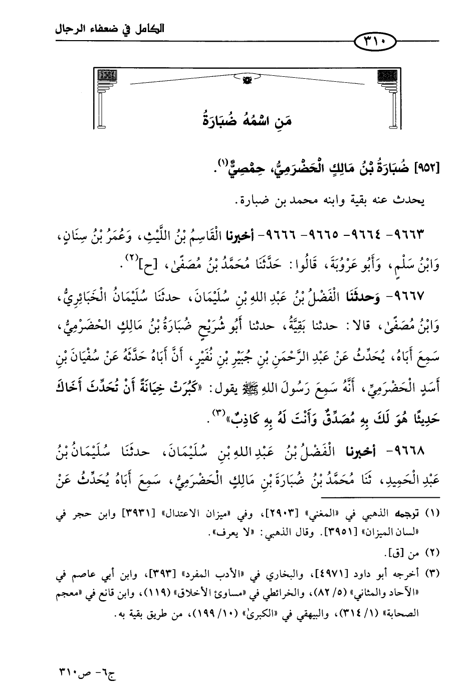 (1) في طبعة الرشد: «لا أعلم يرويه غير بَقِية عن ضبارة»، وهو علي الصواب في طبعة دار الكتب العلمية، و «مختصر الكامل» 1/ 437 (951)، وانظر الروايتين قبله: عن بقية، وعن محمد بن ضبارة، كلاهما عن ضبارة.