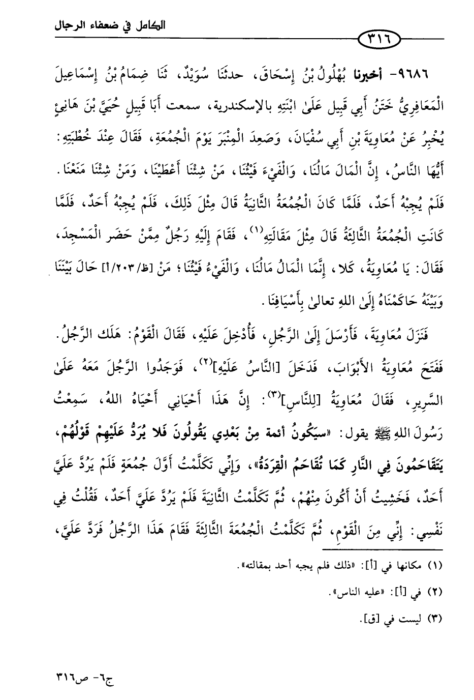 9686 - أخبرنا بهلول بن إسحاق، حَدثنا سويد، حَدثنا ضمام بن إسماعيل المعافري، ختن أبي قبيل علي ابنته بالإسكندرية، سمعت أبا قبيل حيي بن هانئ يخبر، عن معاوية بن أبي سفيان، وصعد المنبر يوم الجمعة، فقال عند خطبته: أيها الناس إن المال مالنا والفيء فيئنا، من شئنا أعطينا ومن شئنا منعنا، فلم يجبه أحد، فلما كان الجمعة الثانية قال مثل ذلك فلم يجبه أحد، فلما كانت الجمعة الثالثة قال مثل مقالته، فقام إليه رجل ممن حضر المسجد، فقال: يا معاوية، كلا إنما المال مالنا والفيء فيئنا، من حال بيننا وبينه حاكمناه إلي الله بأسيافنا، فنزل معاوية فأرسل إلي الرجل، فَأُدْخِل عليه، فقال القوم: هلك الرجل، ففتح معاوية الأبواب فدخل عليه الناس فوجدوا الرجل معه علي السرير، فقال معاوية للناس: إن هذا أحياني أحياه الله، سمعت رسول الله صَلي الله عَليه وسَلم يقول: سيكون أئمة من بعدي يقولون فلا يرد عليهم قولهم، يتقاحمون في النار كما تقاحم القردة، وإني تكلمت أول جمعة فلم يرد علي أحد فخشيت أن أكون منهم، ثم تكلمت الثانية فلم يرد علي أحد، فقلت في نفسي: إني من القوم، ثم تكلمت الجمعة الثالثة فقام هذا الرجل فرد علي، فأحياني أحياه الله، فرجوت أن يخرجني الله منهم، فأعطاه وأجازه.