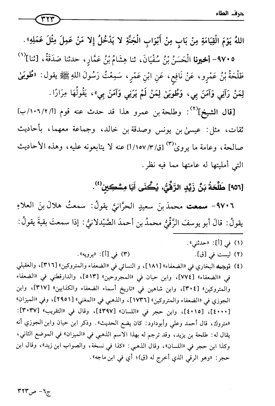 9706 - سمعت مُحمد بن سعيد الحراني يقول: سَمعتُ هلال بن العلاء يقول: قال أَبو يوسف الرقي مُحمد بن أحمد الصيدلانِي: إذا سمعت بقية يقول: حَدثنا أَبو مسكين الرقي فاعلم أنه يريد به طلحة بن زيد.