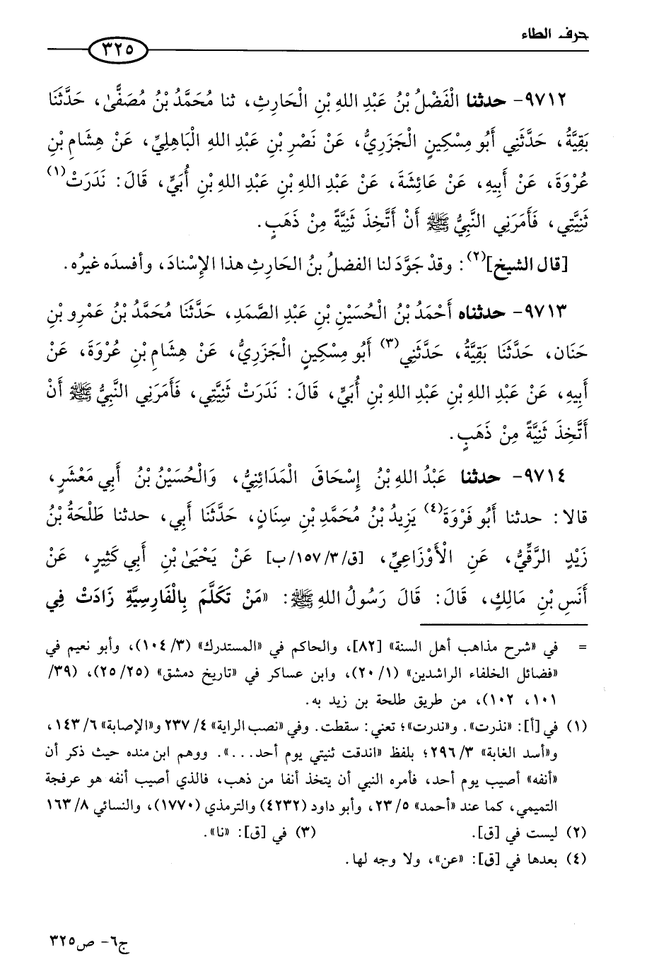 9713 - حدثناه أحمد بن الحسين بن عَبد الصمد، حَدثنا مُحمد بن عَمرو بن حنان، حَدثنا بقية، حَدَّثني أَبو مسكين الجزري، عن هشام بن عروة، عن أبيه، عن عَبد الله بن عَبد الله بن أُبَي، قال: ندرت ثنيتي، فأمرني النبي صَلي الله عَليه وسلم أن أتخذ ثنية من ذهب.