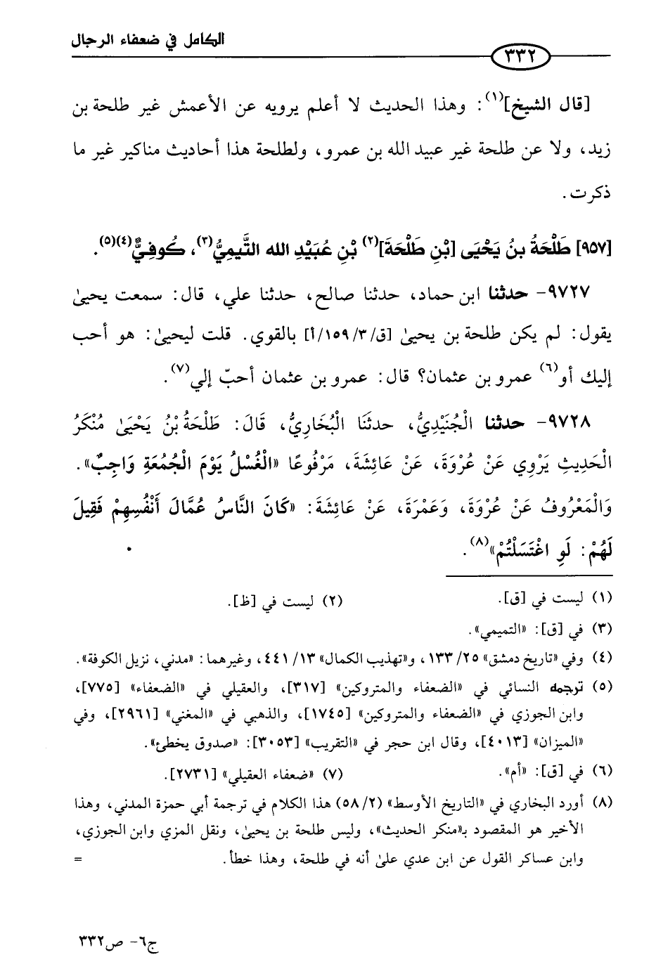 9728 - حَدثنا الجنيدي، حَدثنا البُخاري قال: طلحة بن يَحيي منكر الحديث يروي عن عروة عن عائشة مرفوعا؛ الغسل يوم الجمعة واجب، والمعروف عن عروة، وعمرة، عن عائشة؛ كان الناس عمال أنفسهم، فقيل لهم: لو اغتسلتم.