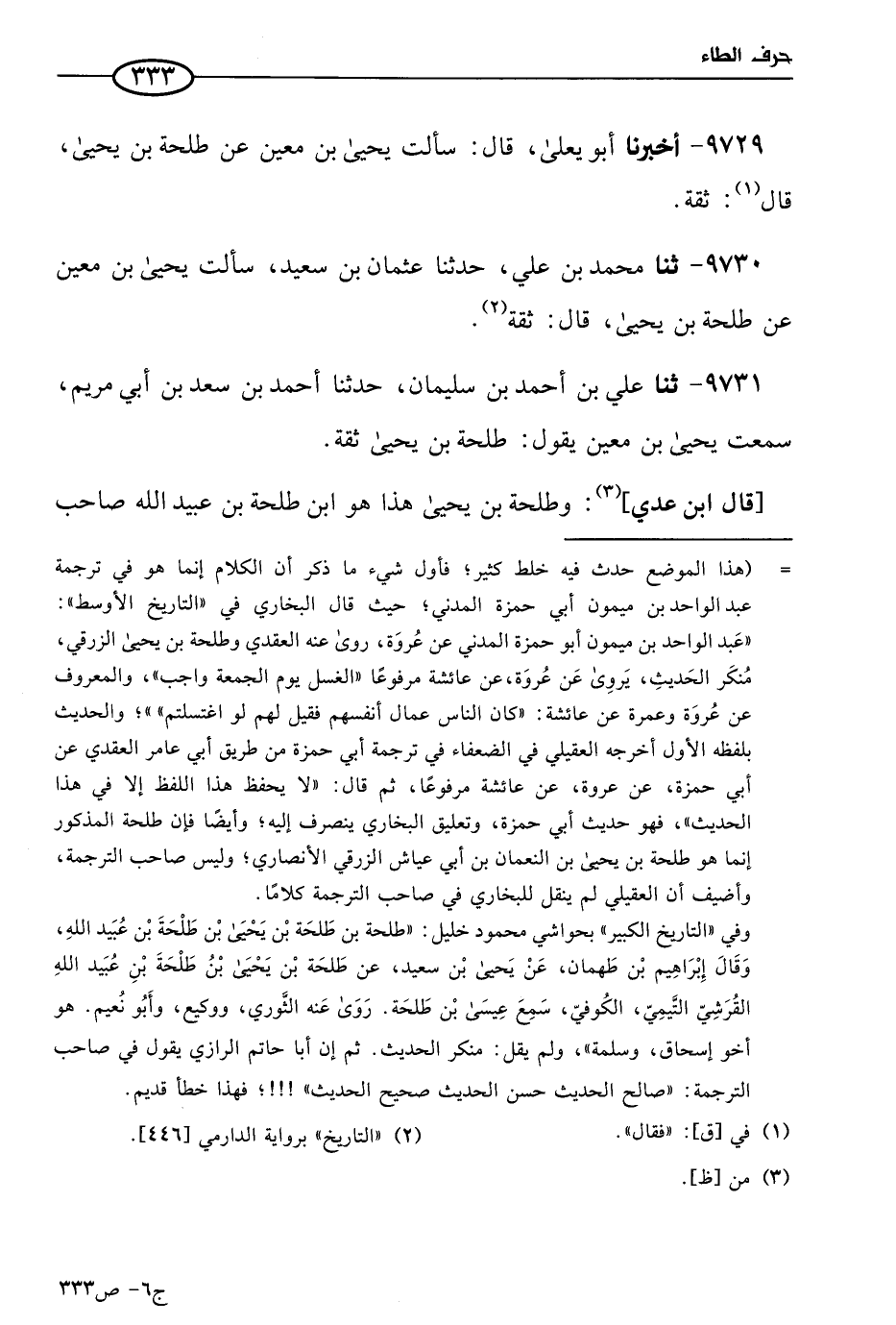 9731 - حَدثنا علي بن أحمد بن سليمان، حَدثنا أحمد بن سعد بن أبي مريم، سمعت يَحيي بن مَعين يقول: طلحة بن يَحيي ثقة.