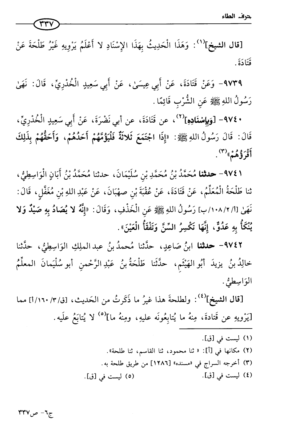 9742 - حَدثنا ابن صاعد، حَدثنا مُحمد بن عَبد الملك الواسطي، حَدثنا خالد بن يزيد أَبو الهيثم، حَدثنا طلحة بن عَبد الرحمن أَبو سليمان المعلم الواسطي.