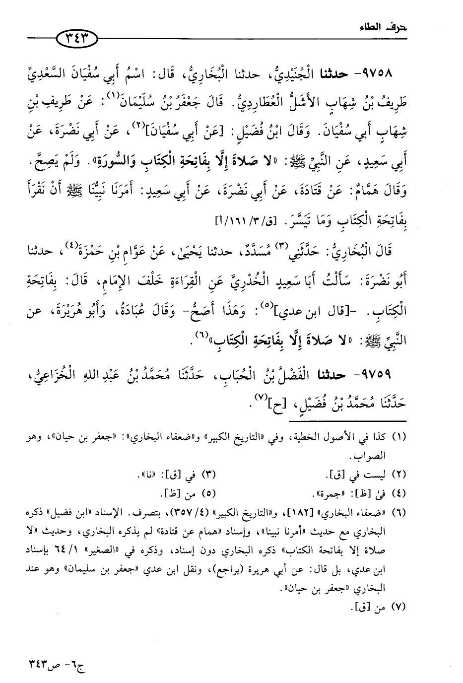 9758 - حَدثنا الجنيدي، حَدثنا البُخاري قال: اسم أبي سفيان السعدي طريف بن شهاب الأشل العطاردي، قال جَعفر بن حَيَّان (1): عن طريف بن شهاب أَبي سفيان، وقال ابن فضيل: عن أبي سُفيان، عن أبي نضرة، عن أبي سعيد، عن النبي صَلي الله عَليه وسلم: لا صلاة إلا بفاتحة الكتاب والسورة. ولم يصح.