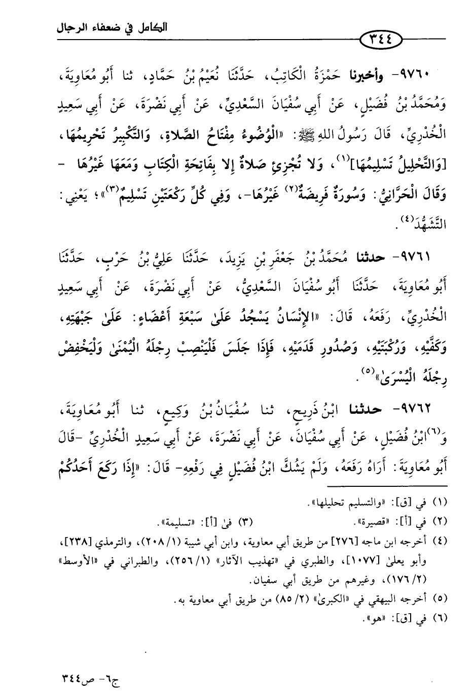 9760 - وأخبرنا حمزة الكاتب، حَدثنا نعيم بن حماد، حَدثنا أَبو معاوية، ومُحمد بن فضيل، عن أبي سفيان السعدي، عن أبي نضرة، عن أبي سعيد الخدري، قال رسول الله صَلي الله عَليه وسلم: الوضوء مفتاح الصلاة والتكبير تحريمها والتحليل تسليمها، ولا تجزيء صلاة إلا بفاتحة الكتاب ومعها غيرها،- وقال الخزاعي (1): وسورة فريضة غيرها، وفي كل ركعتين تسليم، يعني التشهد.