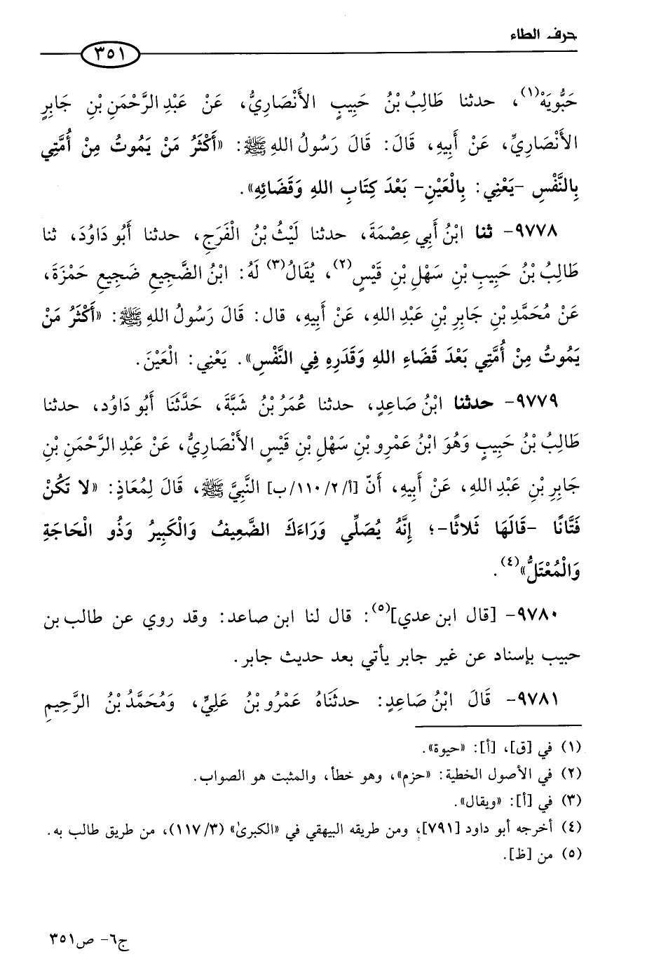 9778 - حَدثنا ابن أبي عصمة، حَدثنا ليث بن الفرج، حَدثنا أَبو داود، حَدثنا طالب بن حبيب بن سهل بن قيس يقال له: ابن الضجيع ضجيع حمزة، عن مُحمد بن جابر بن عَبد الله، عن أبيه قال: قال رسول الله صَلي الله عَليه وسلم: أكثر من يموت من أُمَّتِي بعد قضاء الله وقدره، في النفس يعني العين.