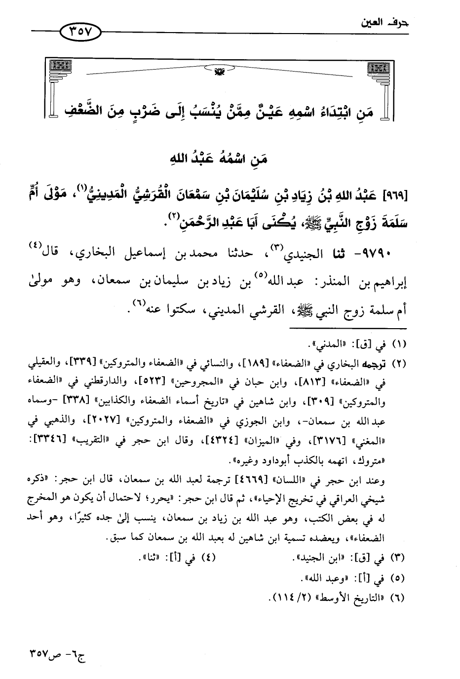 [969] عَبد الله بن زياد بن سليمان بن سمعان القرشي المديني، مولي أُم سَلَمة، زوج النبي صَلي الله عَليه وسلم، يُكْنَي أبا عَبد الرحمن.