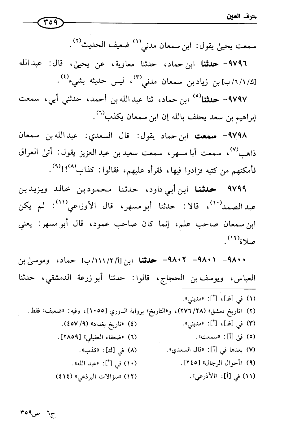9798 - سمعتُ ابن حماد يقول: قال السعدي: عَبد الله بن سمعان ذاهب، سمعت أبا مسهر، سمعت سعيد بن عَبد العزيز يقول: أتي العراق فأمكنهم من كتبه، فزادوا فيها، فقرأه عليهم، فقالوا: كذاب.
