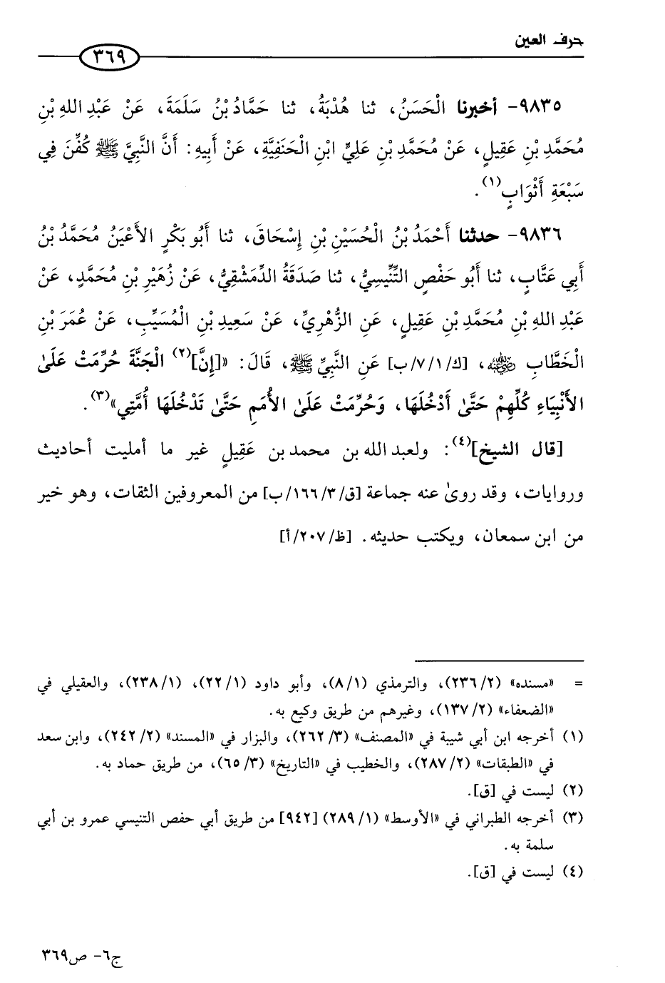 9835 - أخبرنا الحسن، حَدثنا هدبة، حَدثنا حماد بن سلمة، عن عَبد الله بن مُحمد بن عَقِيل عن مُحمد بن علي بن الحنفية، عن أبيه؛ أن النبي صَلي الله عَليه وسلم كفن في سبعة أثواب.