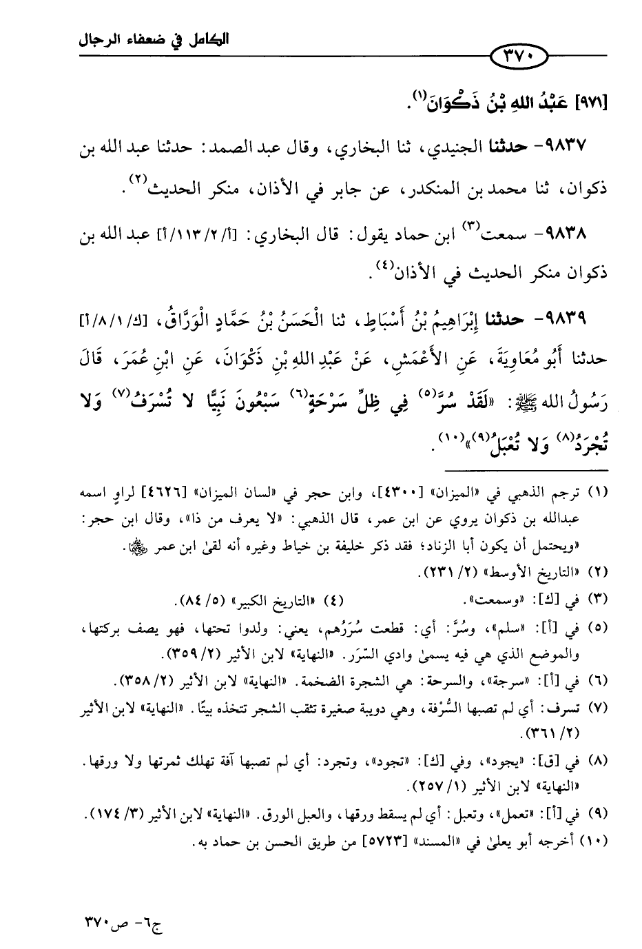 9837 - حَدثنا الجنيدي، حَدثنا البُخاري، وقال عَبد الصمد: حَدثنا عَبد الله بن ذكوان، حَدثنا مُحمد بن المنكدر، عن جابر؛ في الأذان، منكر الحديث.