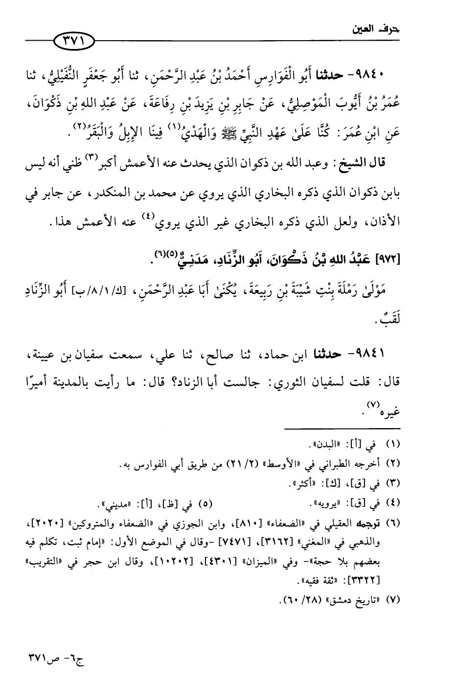 9841 - حَدثنا ابن حماد، حَدثنا صالح، حَدثنا علي، سمعت سفيان بن عُيَينة، قال: قلتُ لسفيان الثَّوري: جالست أبا الزناد؟ قال: مَا رأيتُ بالمدينة أميرا غيره.