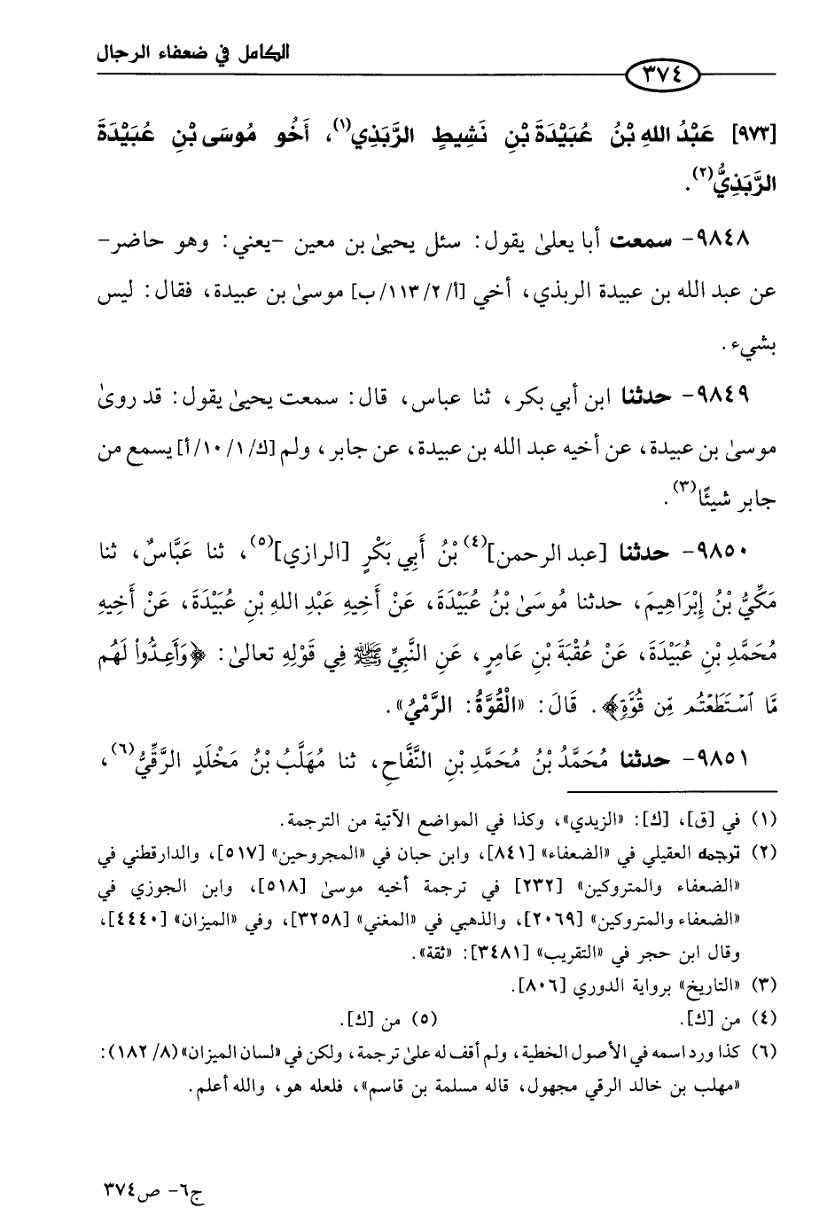9848 - سمعت أبا يعلي يقول: سئل يَحيي بن مَعين، يعني وهو حاضر، عن عَبد الله بن عبيدة الربذي، أخي موسي بن عبيدة، فقال: ليس بشَيءٍ.