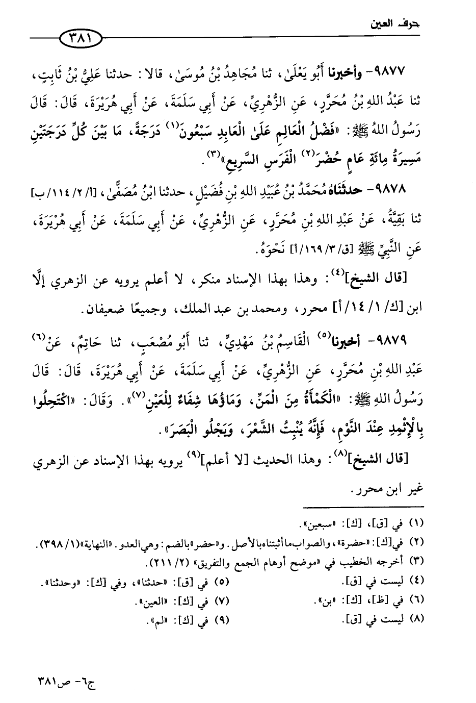 9878 - حَدثناهُ مُحمد بن عُبيد الله بن فضيل، حَدثنا ابن مُصَفَّي، حَدثنا بَقِية، عن عَبد الله بن محرر، عن الزُّهْري، عن أبي سلمة، عن أبي هريرة، عن النبي صَلي الله عَليه وسلم، نحوه.