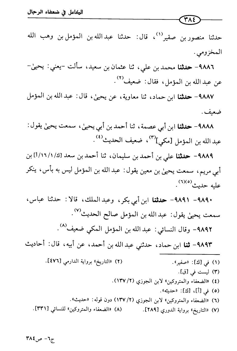 9890 - 9891 - حَدثنا ابن أبي بكر، وعَبد الملك، قالا: حَدثنا عباس سمعت يَحيي يقول: عَبد الله بن المؤمل صالح الحديث.