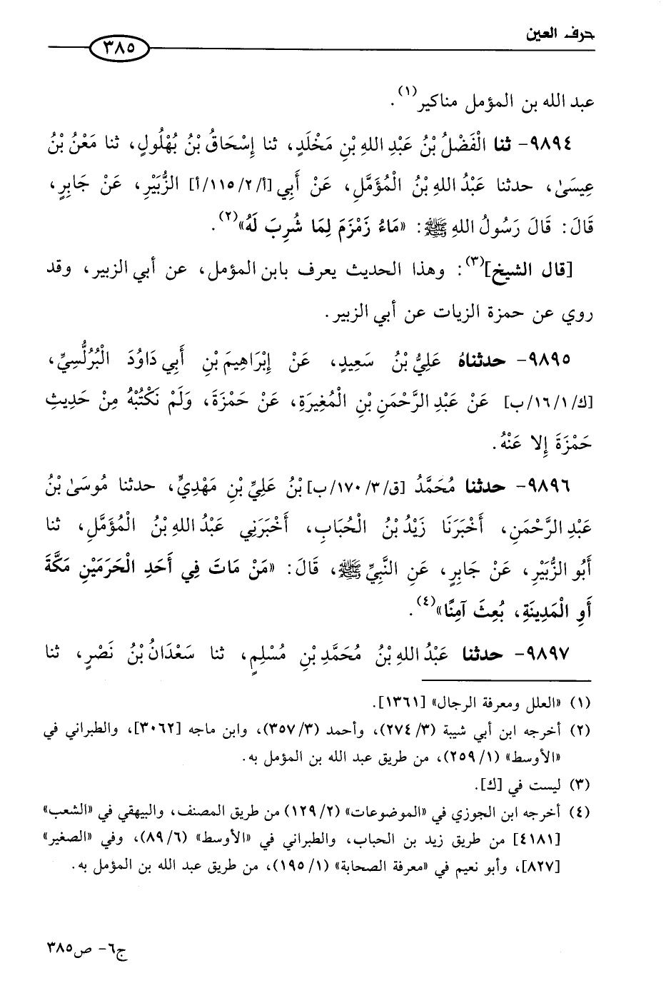 9896 - حَدثنا مُحمد بن علي بن مهدي، حَدثنا موسي بن عَبد الرحمن، أخبرنا زيد بن الحباب، أخبرني عَبد الله بن المؤمل، حَدثنا أَبو الزبير عن جابر عن النبي صَلي الله عَليه وسَلم قال: من مات في أحد الحرمين مكة أو المدينة بعث آمنا.