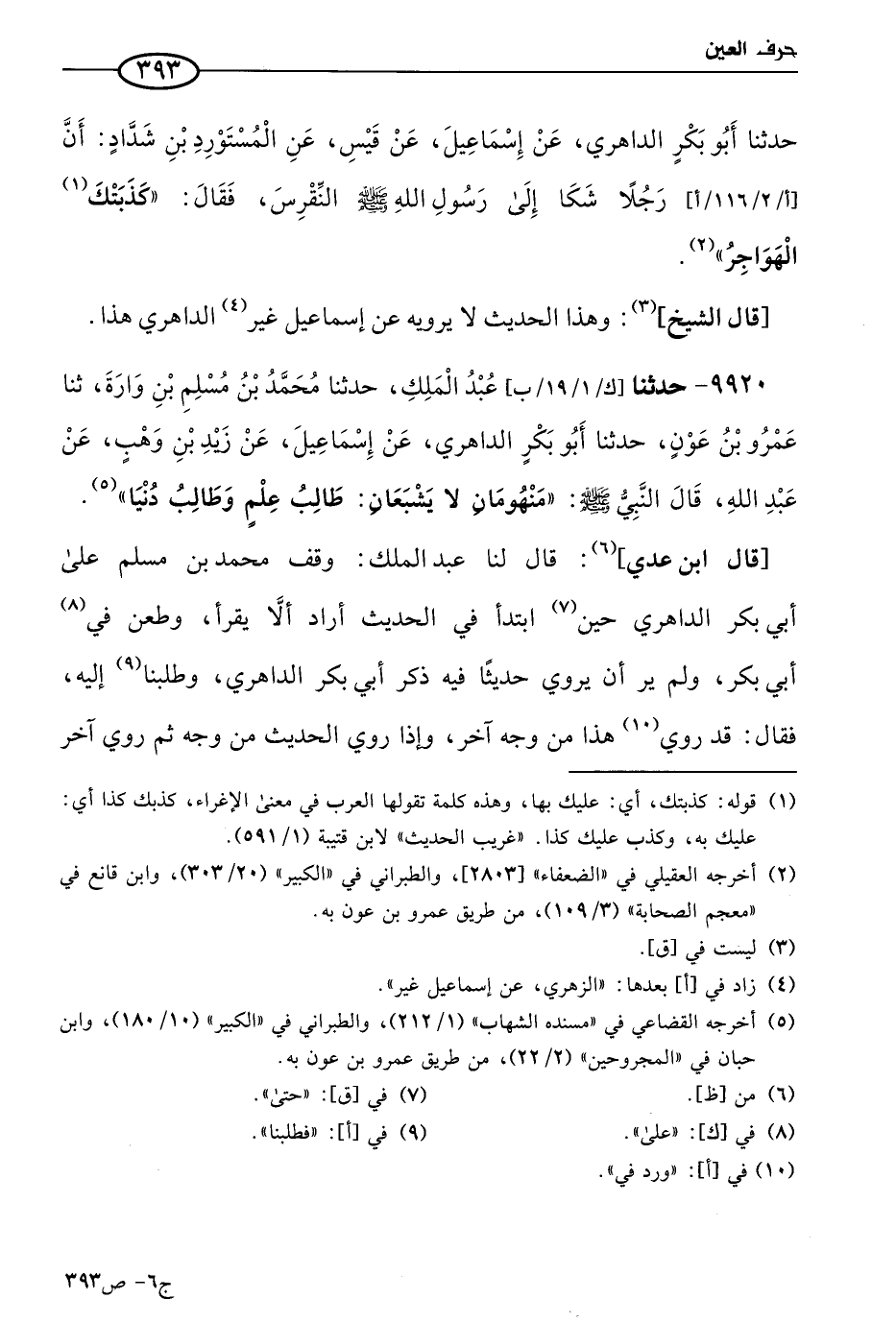 9920 - حَدثنا عَبد الملك، حَدثنا مُحمد بن مسلم بن وارة، حَدثنا عَمرو بن عون، حَدثنا أَبو بكر الداهري عن إسماعيل عن زيد بن وهب، عن عَبد الله، قال النبي صَلي الله عَليه وسلم: منهومان لا يشبعان: طالب عالم، وطالب دنيا.