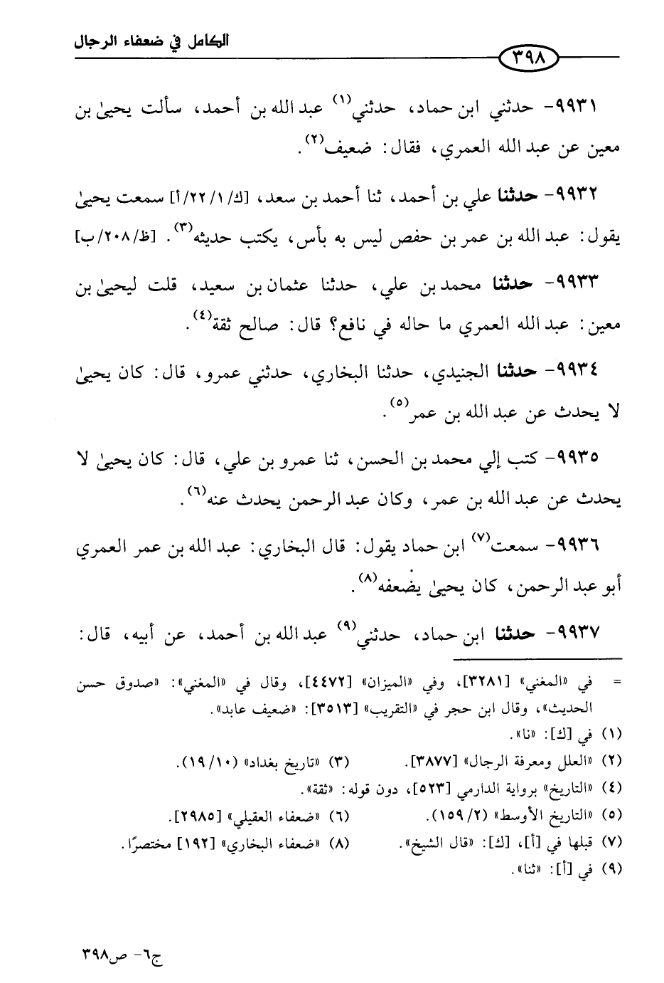 9931 - حَدَّثني ابن حماد، حَدَّثني عَبد الله بن أحمد، سألتُ يَحيي بن مَعين عن عَبد الله العُمري فقال: ضعيف.