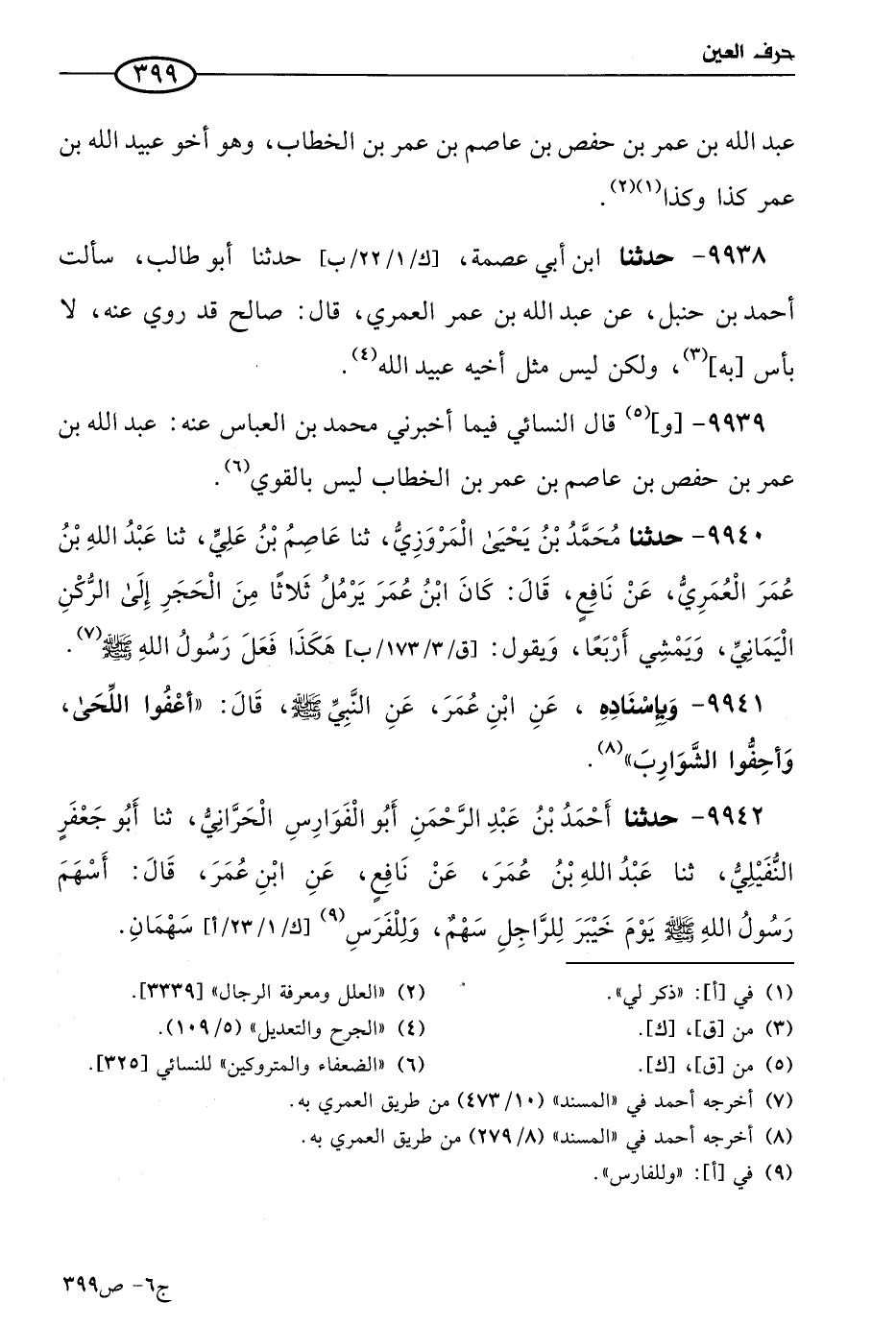 9942 - حَدثنا أحمد بن عَبد الرحمن أَبو الفوارس الحراني، حَدثنا أَبو جعفر النفيلي، حَدثنا عَبد الله بن عُمر عن نافع، عن ابن عُمر قال: أسهم رسول الله صَلي الله عَليه وسَلم يوم خيبر للراجل سهم وللفرس سهمان.