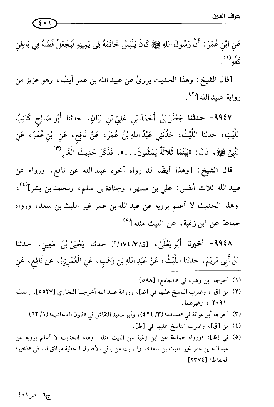 قال الشيخ: وهذا أيضا قد رواه أخوه عُبيد الله، عن نافع، ورواه عن عُبيد الله ثلاث أنفس: علي بن مسهر، وجنادة بن سلم، ومحمد بن بشر، وهذا الحديث لا أعلم يرويه عن عَبد الله بن عُمر غير الليث بن سعد، ورواه جماعة عن ابن زغبة عن الليث مثله.