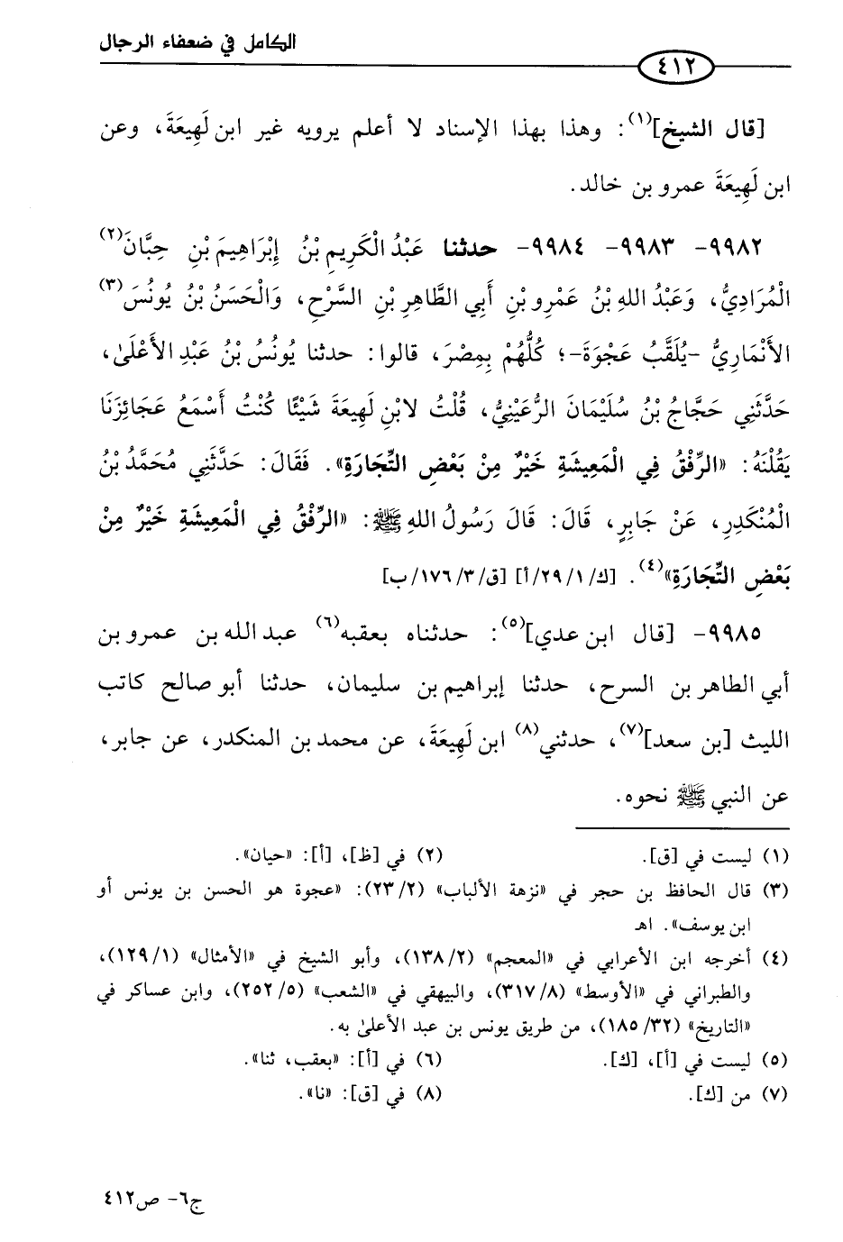 9982 - 9983 - 9984 - حَدثنا عَبد الكريم بن إبراهيم بن حبان المرادي، وعَبد الله بن عَمرو بن أبي الطاهر بن السرح، والحسن بن يُونُس الأنماري، يلقب عجوة، كلهم بمصر، قالوا: حَدثنا يُونُس بن عَبد الأعلي، حَدَّثني حجاج بن سليمان الرعيني، قلت لابن لَهِيعَة شيئا: كنت أسمع عجائزنا يقلنه: الرفق في المعيشة خير من بعض التجارة، فقال: حَدَّثني مُحمد بن المنكدر، عن جابر، قال: قال رسول الله صَلي الله عَليه وسَلم: الرفق في المعيشة خير من بعض التجارة.