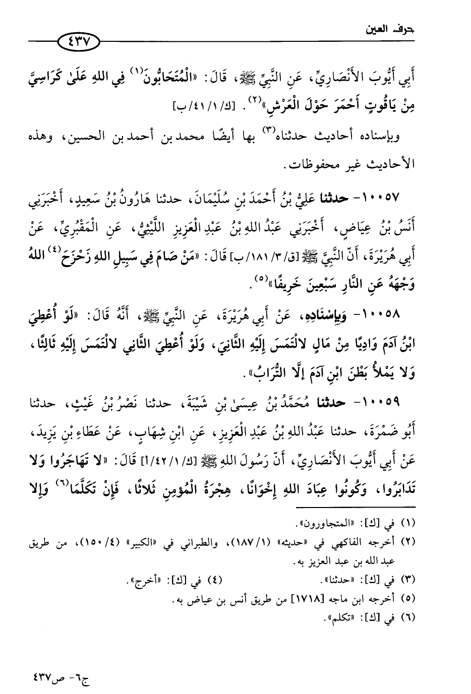 10059 - حَدثنا مُحمد بن عيسي بن شيبة، حَدثنا نصر بن غيث، حَدثنا أَبو ضمرة، حَدثنا عَبد الله بن عَبد العزيز، عن ابن شهاب عن عطاء بن يزيد، عن أبي أيوب الأنصاري، أن رسول الله صَلي الله عَليه وسَلم قال: لا تهاجروا، ولا تدابروا، وكونوا عباد الله إخوانا، هجرة المؤمن ثلاثا، فإن تكلما، وإلا أعرض الله عنهما حتي يتكلما.