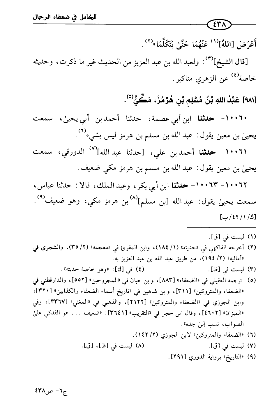 10062 - 10063 - حَدثنا ابن أبي بكر، وعَبد الملك، قالا: حَدثنا عباس، سمعت يَحيي يقول: عَبد الله بن مسلم بن هرمز مكي، وهو ضعيف.