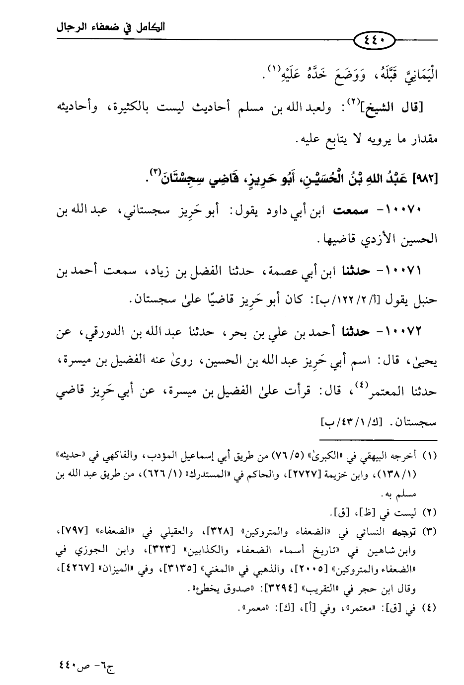 [982] عَبد الله بن الحسين، أَبو حريز، قاضي سجستان.