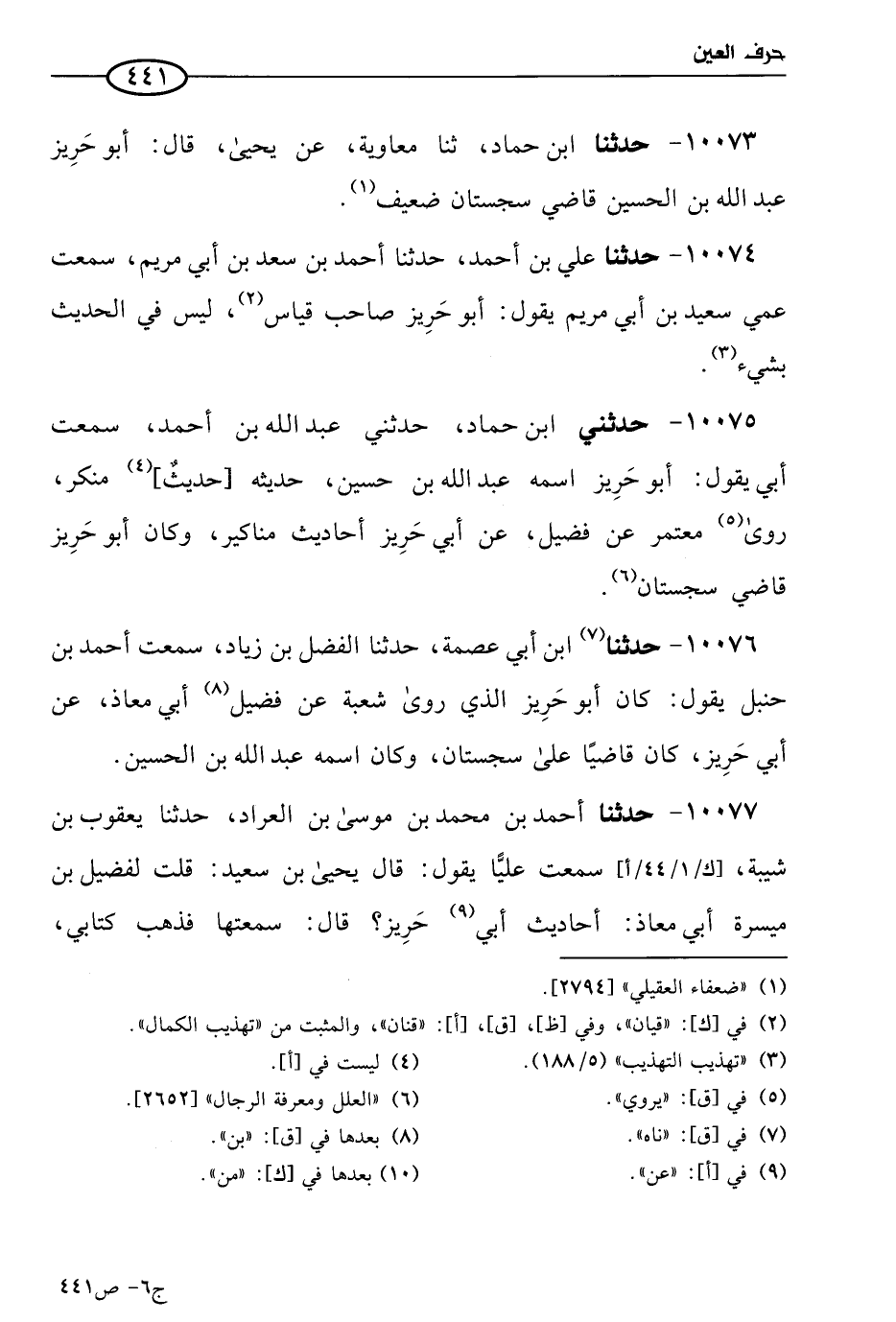 10077 - حَدثنا أحمد بن مُحمد بن موسي بن العراد، حَدثنا يعقوب بن شيبة، سمعت عَليًا يقول: قال يَحيي بن سعيد: قلت لفضيل بن ميسرة أبي معاذ: أحاديث أبي حريز؟ قال: سمعتُها، فذهب كتابي، فأخذتها بعد من إنسان.