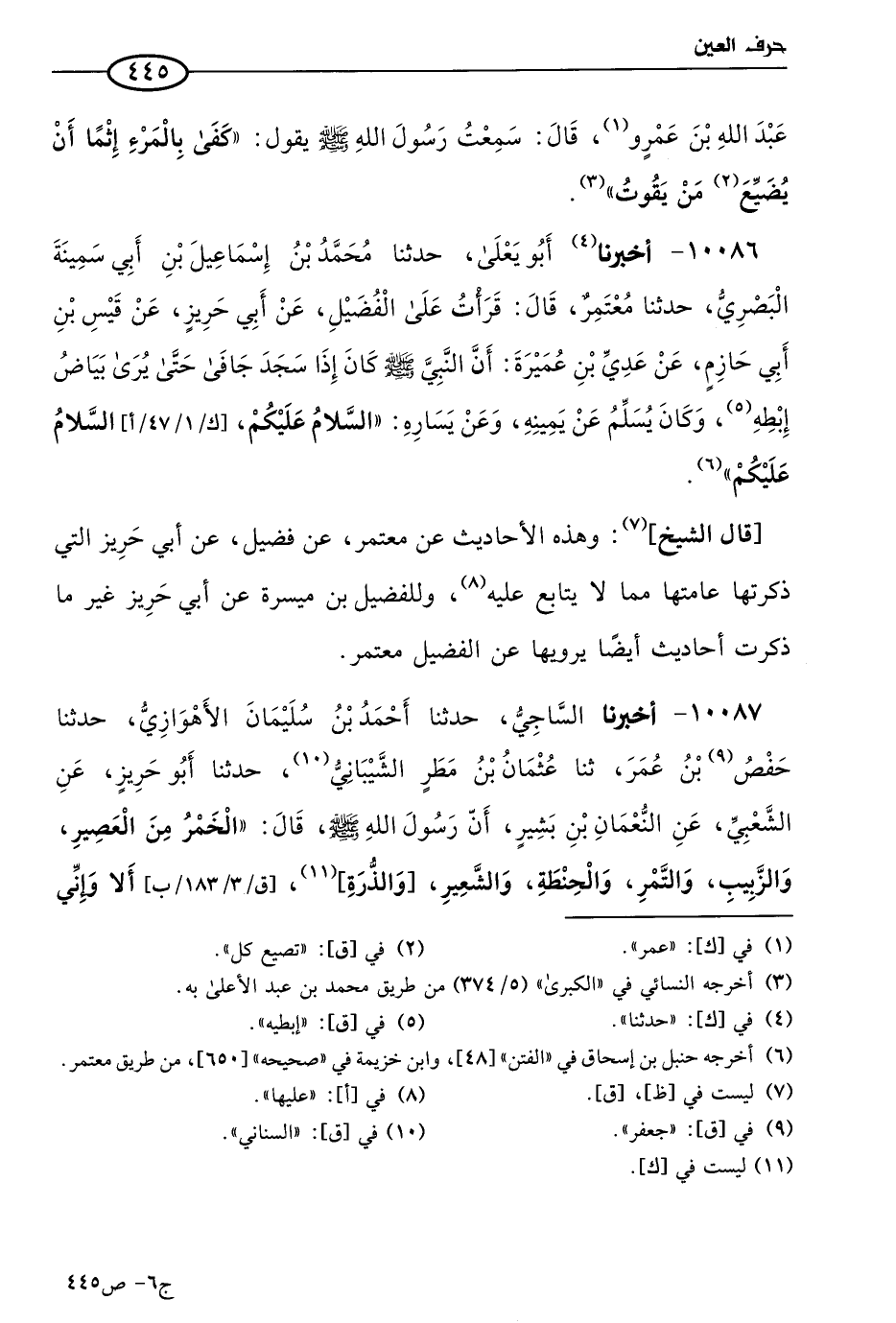 10087 - أخبرنا الساجي، حَدثنا أحمد بن سليمان الأهوازي، حَدثنا حفص بن عُمر، حَدثنا عثمان بن مطر الشيباني، حَدثنا أَبو حريز، عن الشعبي، عن النعمان بن بشير، أن رسول الله صَلي الله عَليه وسَلم قال: الخمر من العصير والزبيب والتمر والحنطة والشعير والذرة، ألا وإني أنهاكم عن كل مسكر.