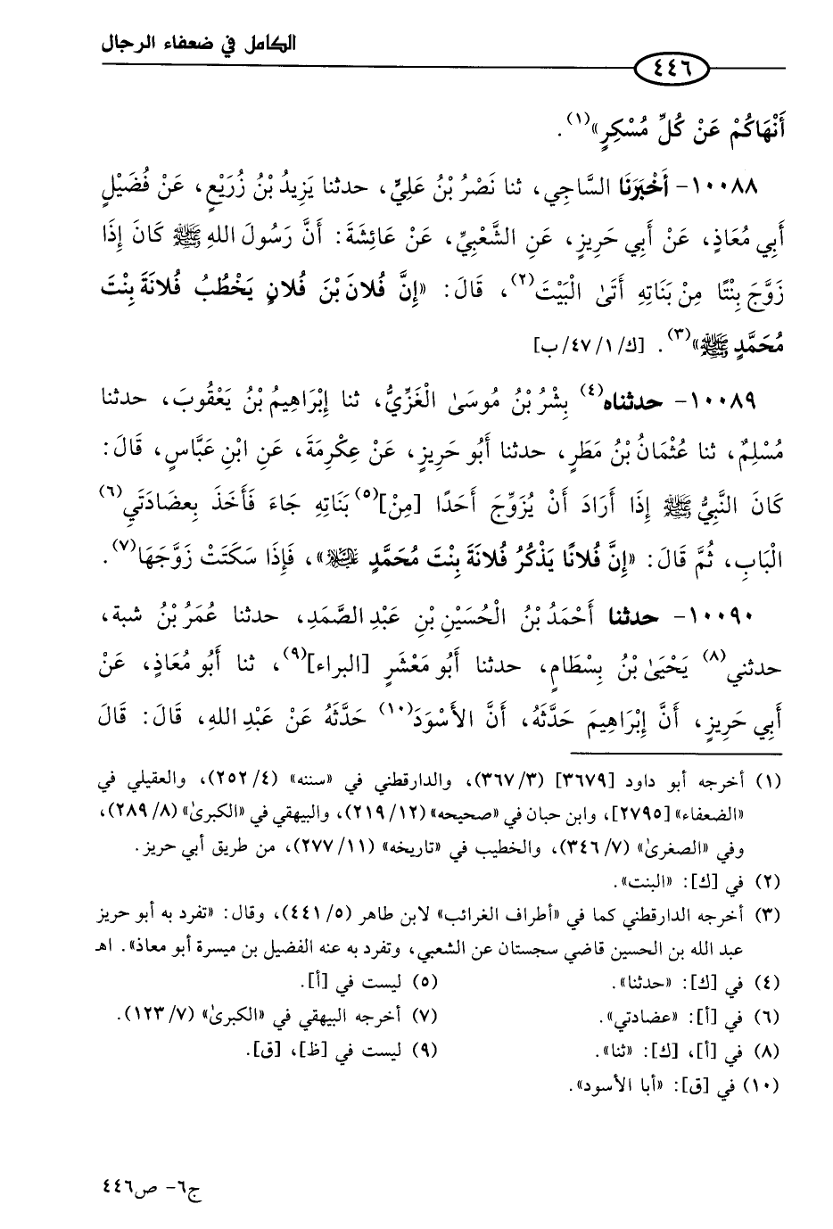 10089 - حَدثناهُ بشر بن موسي الغزي، حَدثنا إبراهيم بن يعقوب، حَدثنا مسلم، حَدثنا عثمان بن مطر، حَدثنا أَبو حريز، عن عِكرمَة، عن ابن عباس، قال: كان النبي صَلي الله عَليه وسلم إذا أراد أن يزوج أحدًا من بناته جاء فأخذ بعضادتي الباب، ثم قال: إِن فلانا يذكر فلانة بنت مُحمد عليه السلام، فإذا سكتت زوجها.