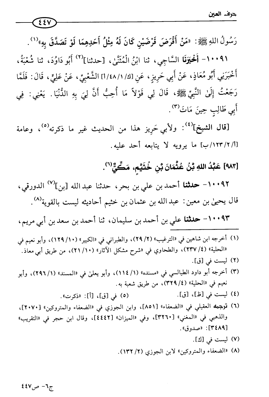 10092 - حَدثنا أحمد بن علي بن بحر، حَدثنا عَبد الله الدورقي، قال يَحيي بن مَعين: عَبد الله بن عثمان بن خثيم أحاديثه ليست بالقوية.