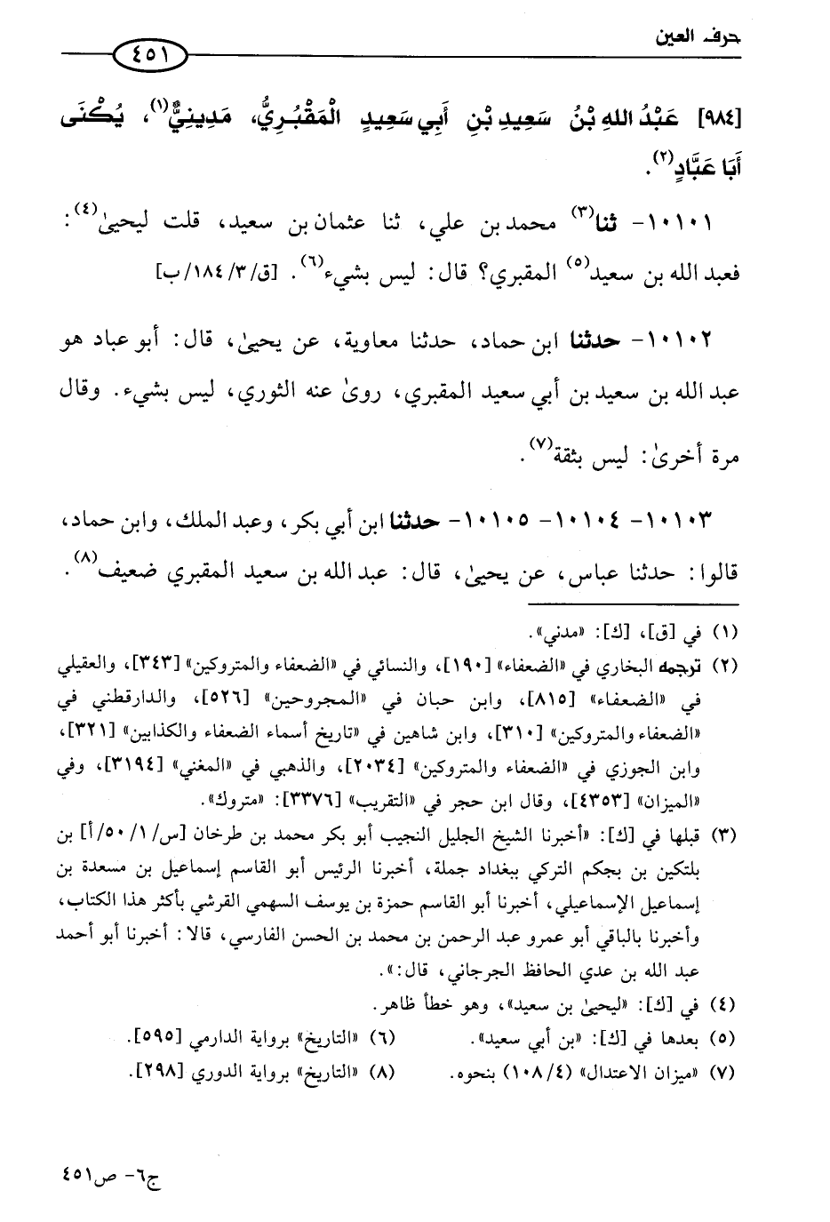 10103 - 10104 - 10105 - حَدثنا أبن أبي بكر، وعَبد الملك، وابن حماد، قالوا: حَدثنا عباس، عن يَحيي قال: عَبد الله بن سعيد المقبري ضعيف.