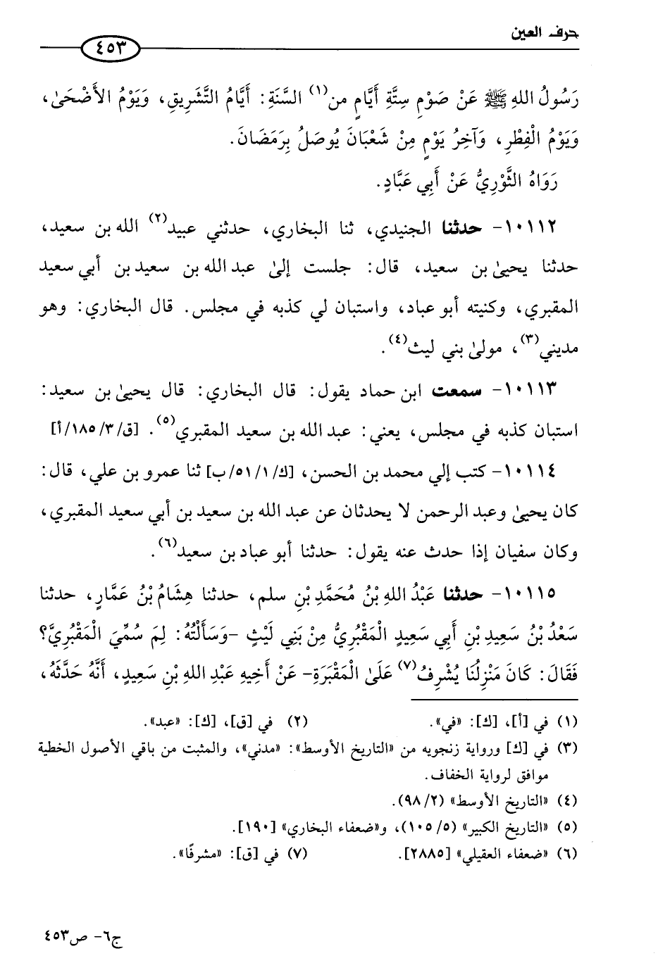 10112 - حَدثنا الجنيدي، حَدثنا البُخاري، حَدَّثني عُبيد الله بن سعيد، حَدثنا يَحيي بن سعيد قال: جلست إلي عَبد الله بن سعيد بن أبي سعيد المقبري، وكنيته أَبو عباد، واستبان لي كذبه في مجلس. قال البُخاري: وهو مديني مولي بني ليث.