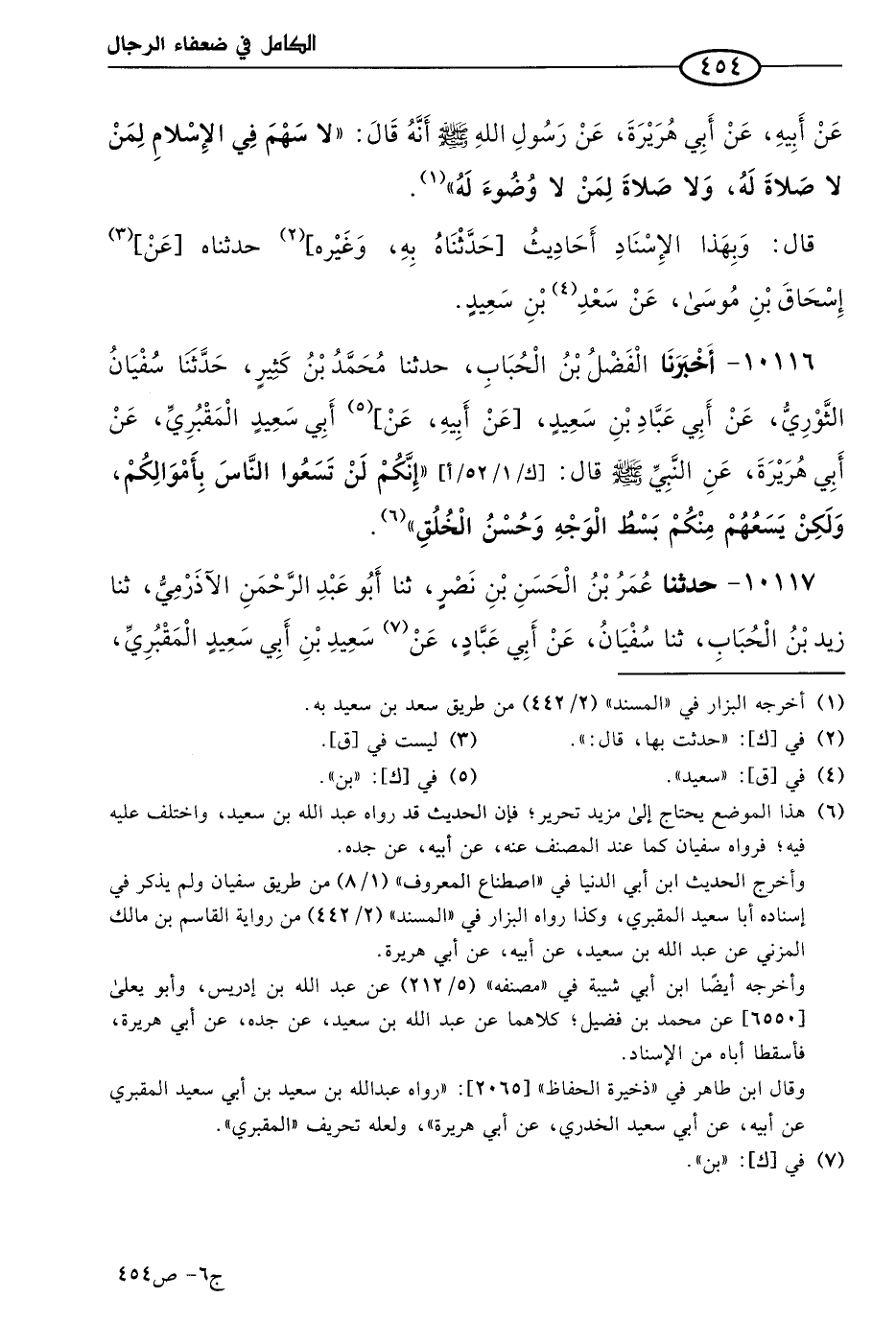 10116 - أخبرنا الفضل بن الحباب، حَدثنا مُحمد بن كثير، حَدثنا سفيان الثَّوري، عن أبي عباد بن سعيد، عن أبيه، عن أبي سعيد المقبري، عن أبي هريرة، عن النبي صَلي الله عَليه وسلم، قال: إنكم لن تسعوا الناس بأموالكم، ولكن يسعهم منكم بسط الوجه وحسن الخلق.
