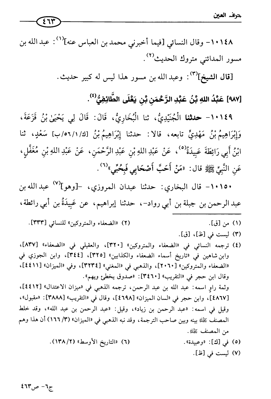 10150 - قال البُخاري: حَدثنا عبدان المروزي، وهو عَبد الله بن عثمان بن جبلة بن أبي رواد (1)، حَدثنا إبراهيم، عن عبيدة بن أبي رائطة، عن عَبد الرحمن بن زياد، عن عَبد الله بن مغفل، عن النبي صَلي الله عَليه وسلم، بهذا، وهو إسناد لا يعرف.