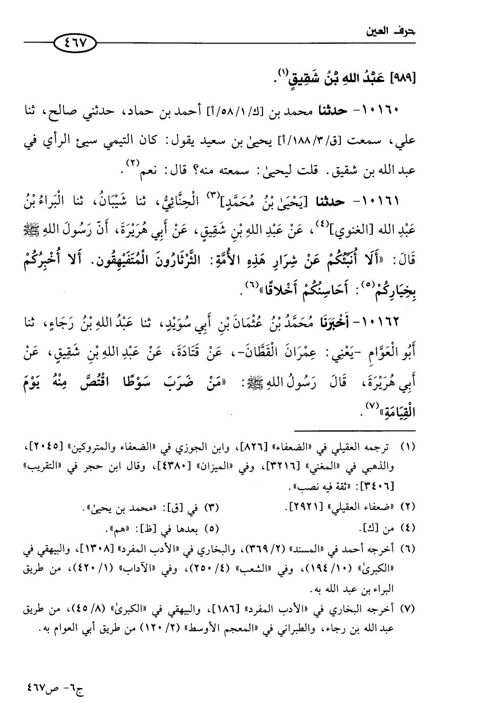 10161 - حَدثنا يَحيي بن مُحمد الحنائي، حَدثنا شيبان، حَدثنا البراء بن عَبد الله الغنوي، عن عَبد الله بن شقيق، عن أبي هريرة، أن رسول الله صَلي الله عَليه وسَلم قال: ألا أنبئكم عن شرار هذه الأمة: الثرثارون المتفيهقون، ألا أخبركم بخياركم، أحاسنكم أخلاقا.