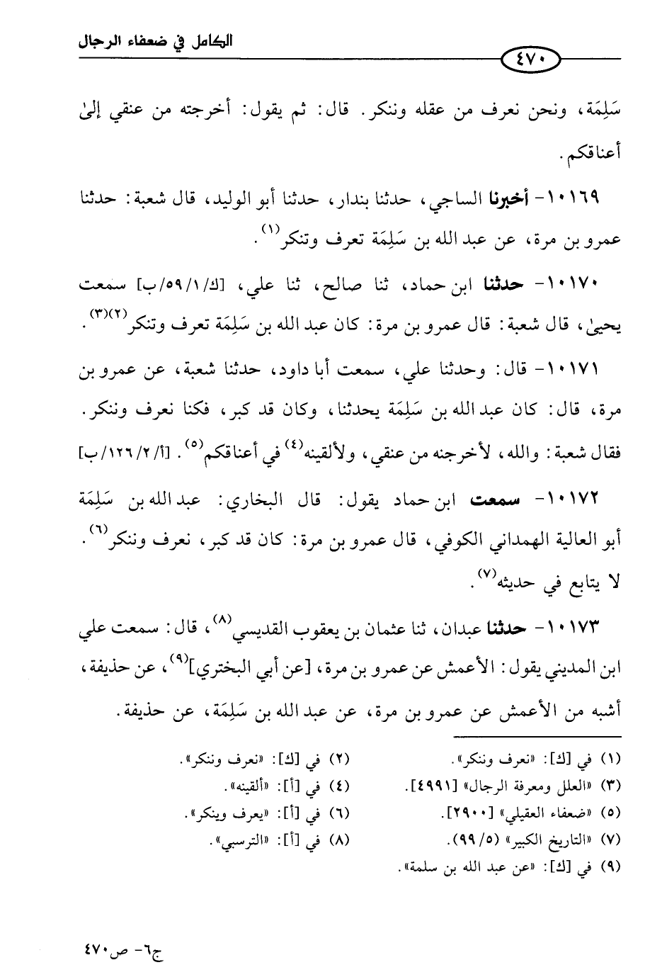 10170 - حَدثنا ابن حماد، حَدثنا صالح، حَدثنا علي، سمعت يَحيي، قال شُعبَة: قال عَمرو بن مرة: كان عَبد الله بن سلمة، تعرف وتنكر.