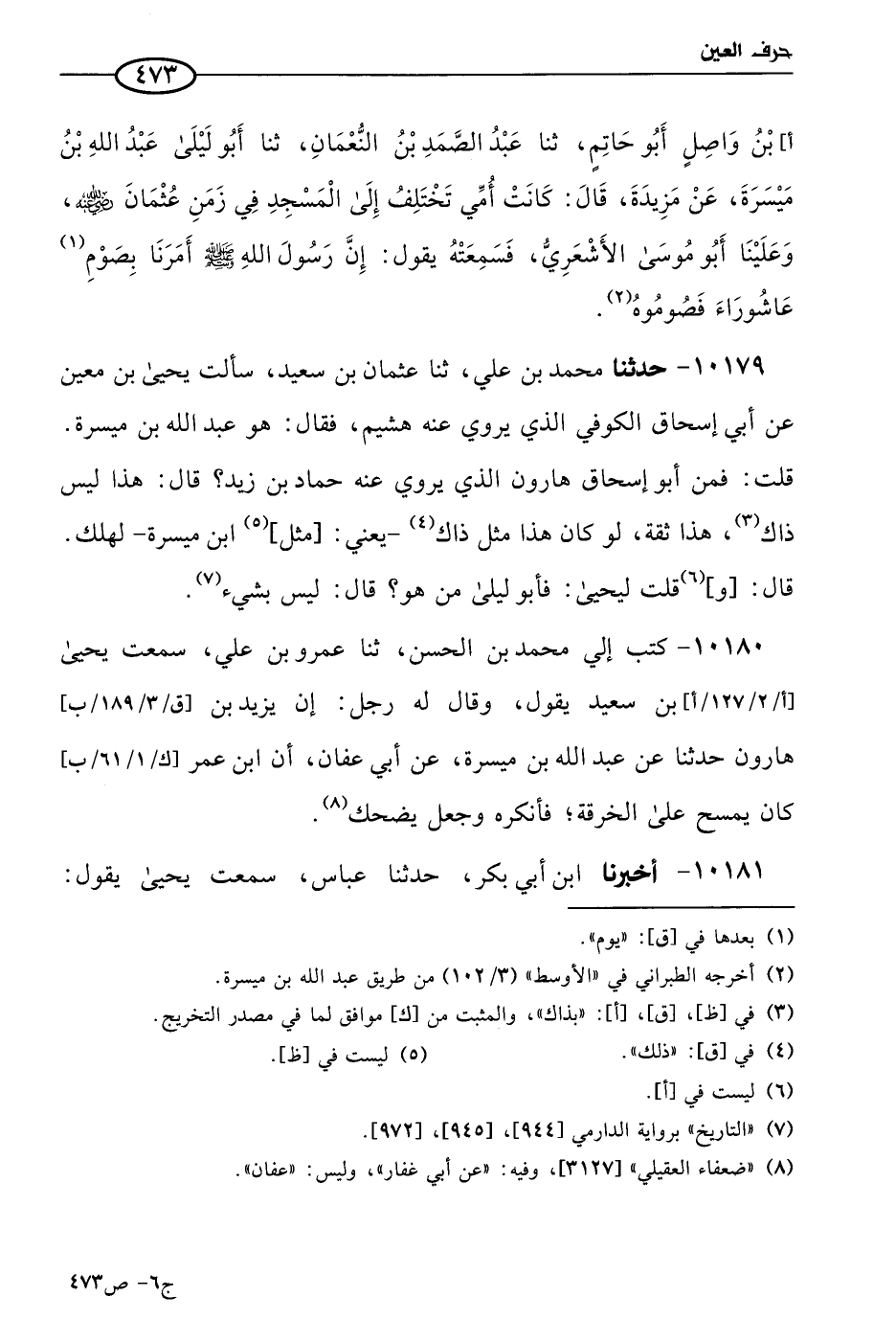 10179 - حَدثنا مُحمد بن علي، حَدثنا عثمان بن سعيد، سألت يَحيي بن مَعين عن أبي إسحاق الكوفي الذي يروي عنه هشيم، فقال: هو عَبد الله بن ميسرة، قلت: فمن أَبو إسحاق هارون الذي يروي عنه حماد بن زيد؟ قال: هذا ليس ذاك، هذا ثقة، لو كان هذا مثل ذاك، يَعني مثل ابن ميسرة لهلك، قال: وقلت ليحيي: فأبو ليلي من هو؟ قال: ليس بشَيءٍ.