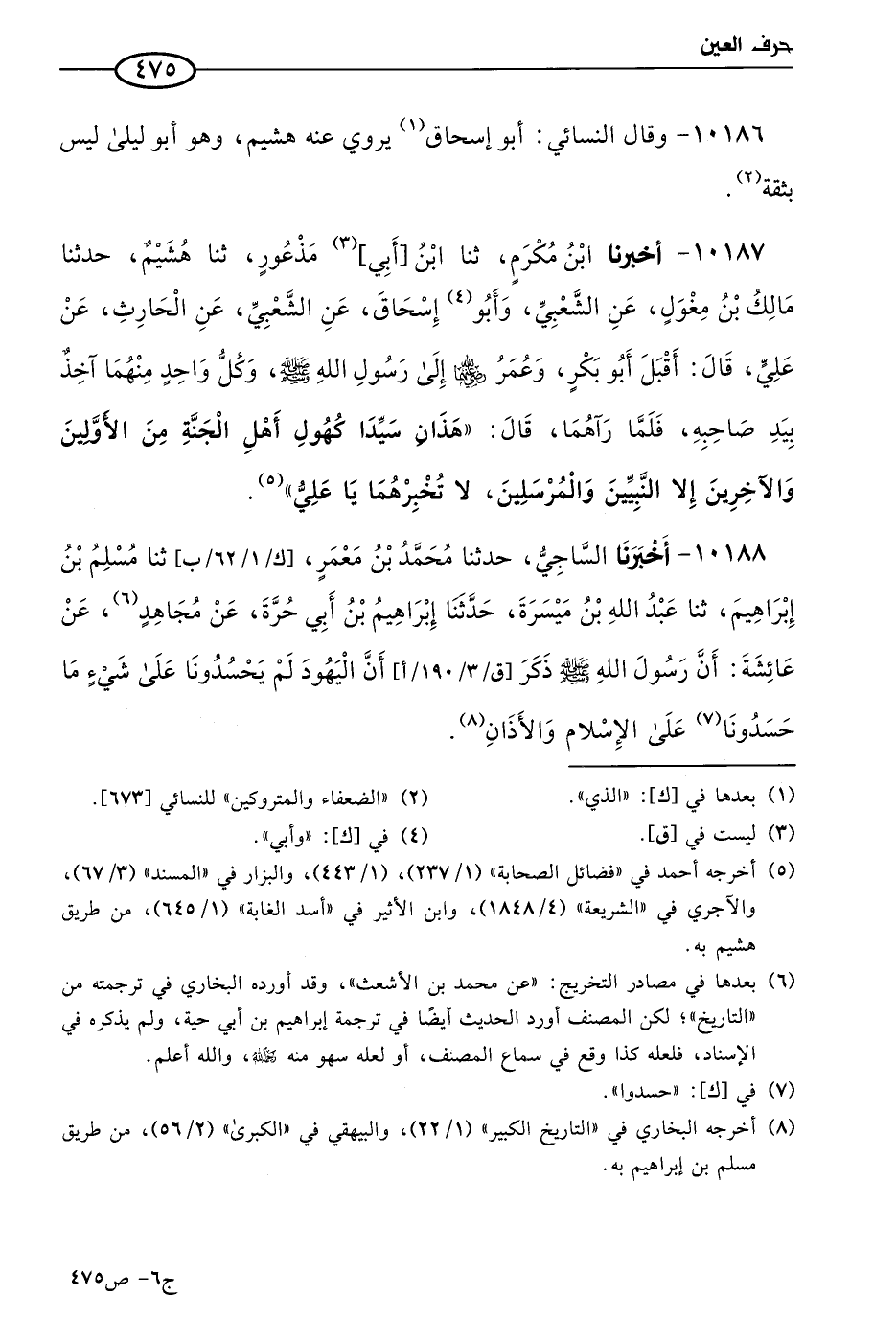 10188 - أخبرنا الساجي، حَدثنا مُحمد بن معمر، حَدثنا مسلم بن إبراهيم، حَدثنا عَبد الله بن ميسرة، حَدثنا إبراهيم بن أبي حُرَّة عن مجاهد عن عائشة؛ أَن رسُول الله صَلي الله عَليه وسلم ذكر أن اليهود لم يحسدونا علي شيء ما حسدونا علي الإسلام والأذان.