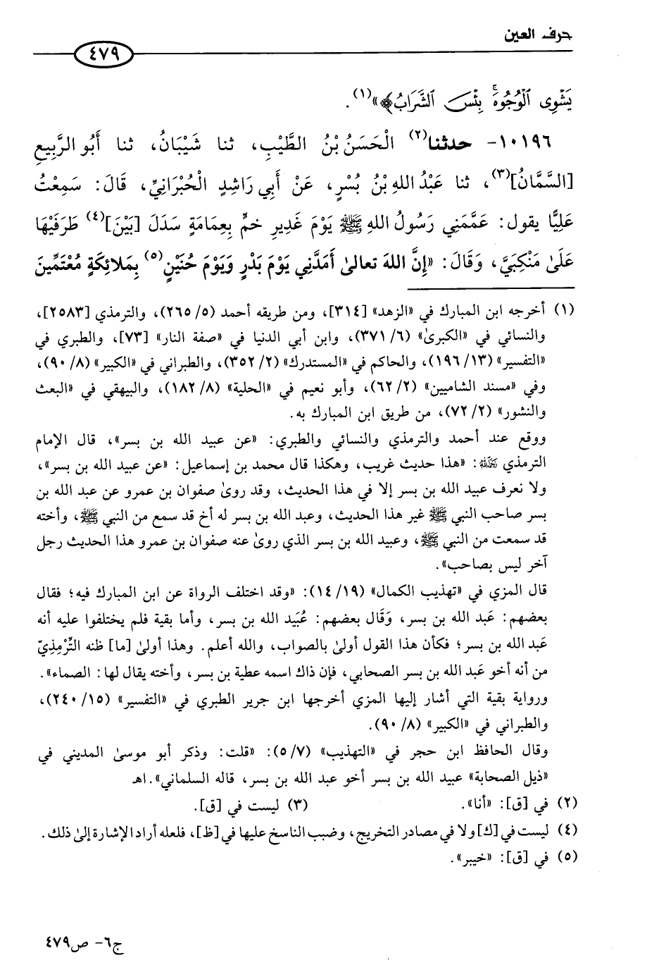 10196 - حَدثنا الحسن بن الطيب، حَدثنا شيبان، حَدثنا أَبو الربيع السمان، حَدثنا عَبد الله بن بسر، عن أبي راشد الحبراني، قال: سمعتُ عَليًا يقول: عممني رسول الله صَلي الله عَليه وسَلم يوم غدير خم بعمامة، سدل بين طرفيها علي منكبي، وقال: إن الله تعالي أمدني يوم بدر ويوم حنين بملائكة معتمين بهذه العمة، وقال: إن العمامة حاجز بين المسلمين والمشركين، ثم تصفح الناس، فإذا رجل بيده قوس عربية، وإذا رجل بيده قوس فارسية، فقال النبي صَلي الله عَليه وسلم: عليكم بهذه وأشباهها ورماح القنا، فإنهما يؤيد الله لكم بها في الأرض ويمكن لكم في البلاد.