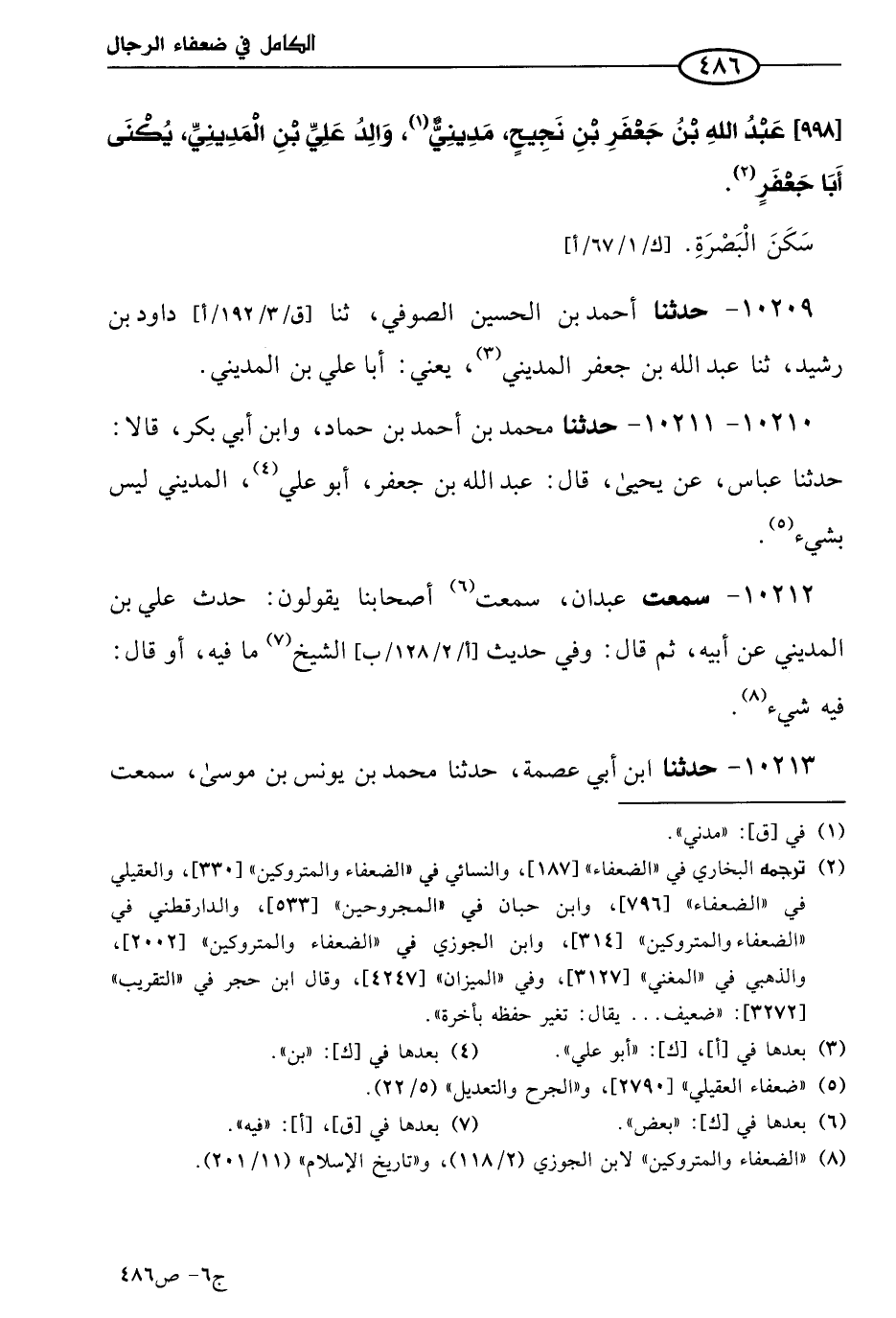 [998] عَبد الله بن جعفر بن نجيح، مديني، والد علي بن المديني، يُكْنَي أبا جعفر.