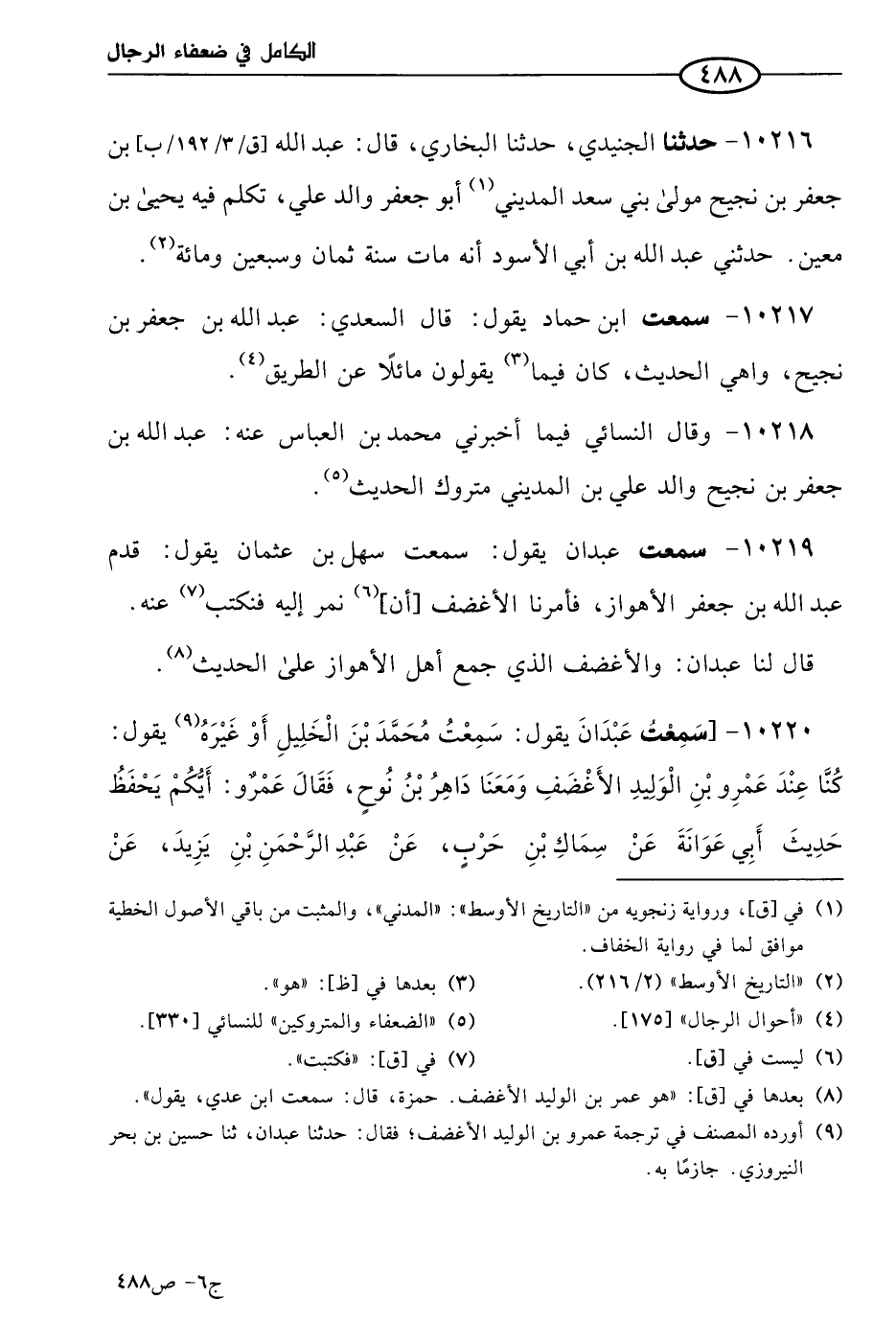 10217 - سمعتُ ابن حماد يقول: قال السعدي: عَبد الله بن جعفر بن نجيح واهي الحديث، كان فيما يقولون: مائلا عن الطريق.