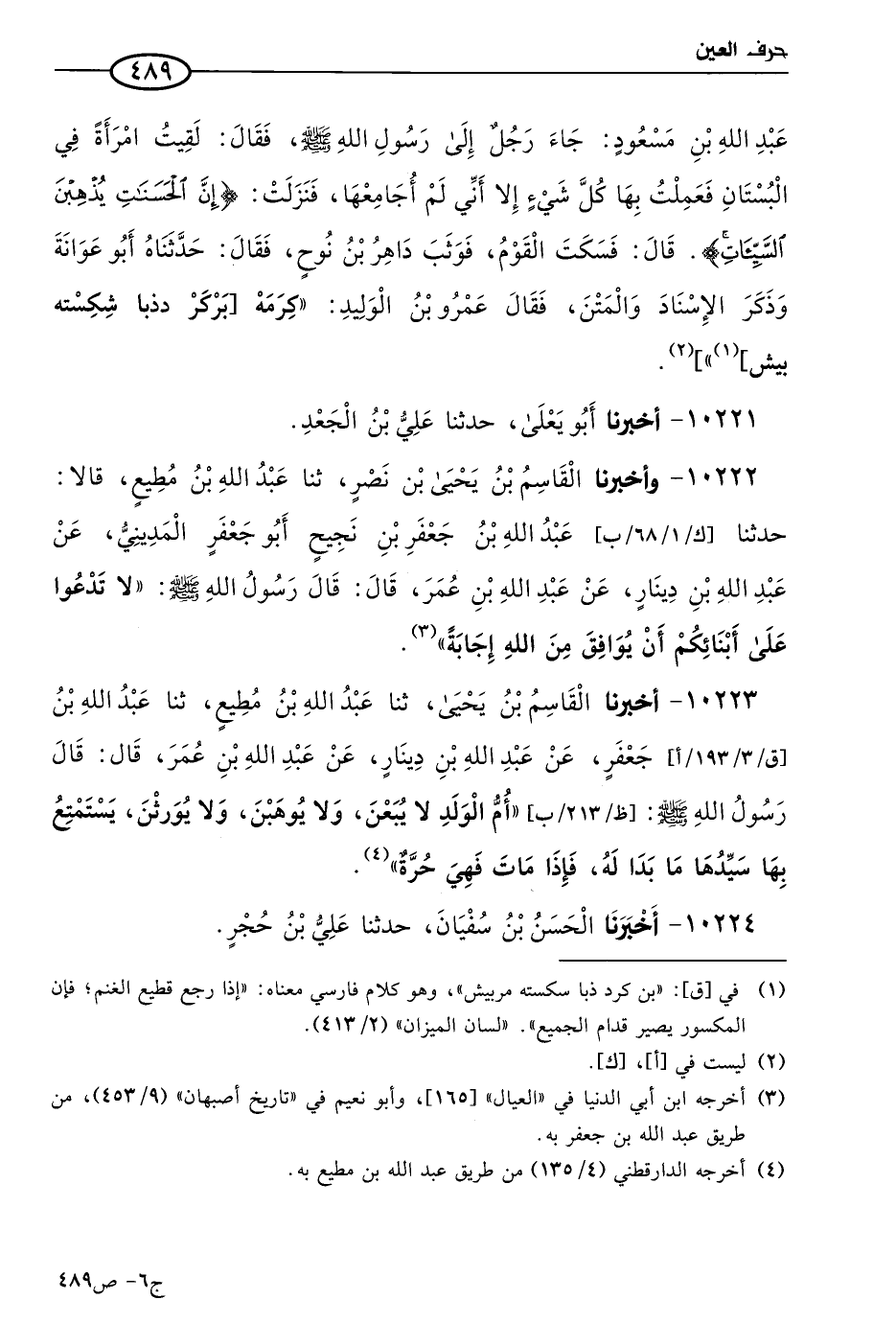10223 - أخبرنا القاسم بن يَحيي، حَدثنا عَبد الله بن مطيع، حَدثنا عَبد الله بن جعفر، عن عَبد الله بن دينار، عن عَبد الله بن عُمر، قال: قال رسول الله صَلي الله عَليه وسَلم: أم الولد لا يبعن، ولا يوهبن، ولا يورثن، يستمتع بها سيدها ما بدا له، فإذا مات فهي حرة.