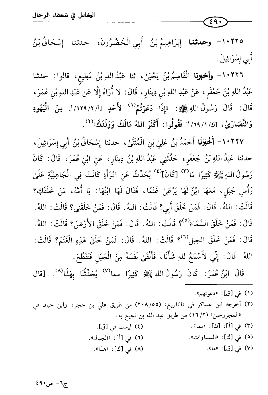 10227 - أخبرنا أحمد بن علي بن المثني، حَدثنا إسحاق بن أبي إسرائيل، حَدثنا عَبد الله بن جعفر، حَدَّثني عَبد الله بن دينار، عن ابن عُمر، قال: كان رسول الله صَلي الله عَليه وسَلم كثيرًا ما كان يحدث عن امرأة كانت في الجاهلية علي رأس جبل، معها ابن لها يرعي غنما، فقال لها ابنها: يا أمه من خلقك؟ قالت: الله، قال: فمن خلق أبي؟ قالت: الله، قال: فمن خلقني؟ قالت: الله، قال: فمن خلق السماء؟ قالت: الله، قال: فمن خلق الأرض؟ قالت: الله، قال: فمن خلق الجبل؟ قالت: الله، قال: فمن خلق هذه الغنم؟ قالت: الله، قال: إني لأسمع لله شأنا، فألقي نفسه من الجبل فتقطع.